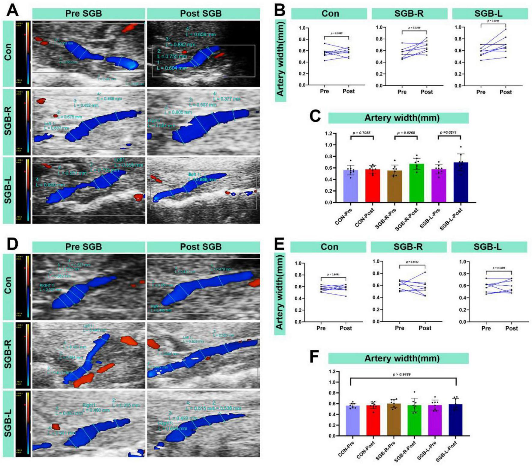 All surviving mice underwent carotid artery monitoring 20 min after SGB. The ipsilateral carotid artery diameter was larger after SGB than before in both the SGB-R and SGB-L groups. Furthermore, this diameter was greater than in the Con group, and the differences were statistically significant (p < 0.05; Figures 7A–C). No significant changes were observed in the contralateral carotid artery diameter in all groups (Figures 7D–F).