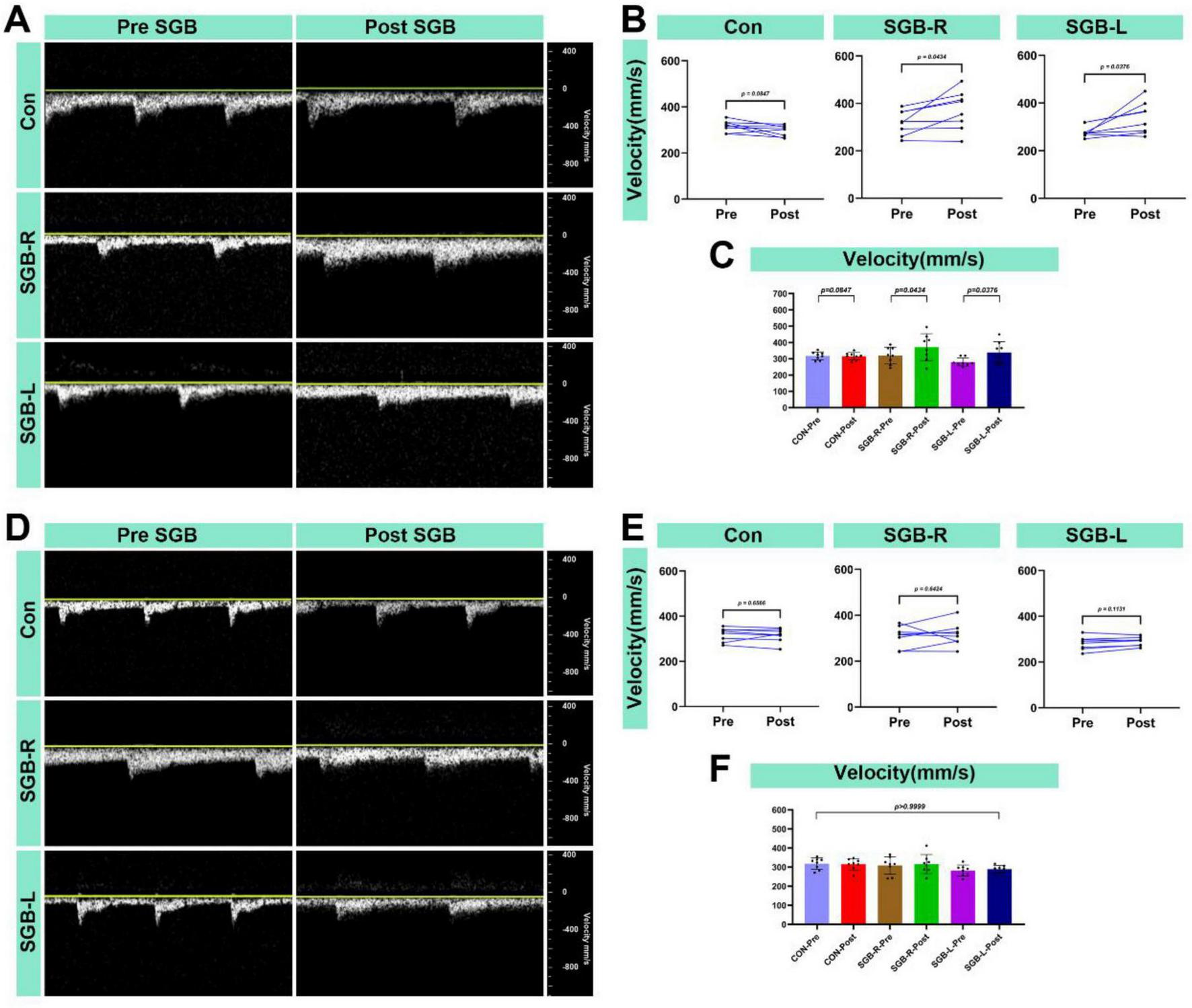 All surviving mice underwent blood flow velocity monitoring 20 min after the SGB intervention. The ipsilateral carotid artery blood flow velocity was higher after SGB than before in both the SGB-R and SGB-L groups. There was no significant change in blood flow velocity in the Con-post. When compared to the Con group, both the SGB-R and SGB-L groups showed an increase in blood flow velocity, and the differences were statistically significant (p < 0.05; Figures 8A–C). No significant changes were detected in the contralateral carotid artery in any of the groups (Figures 8D–F).