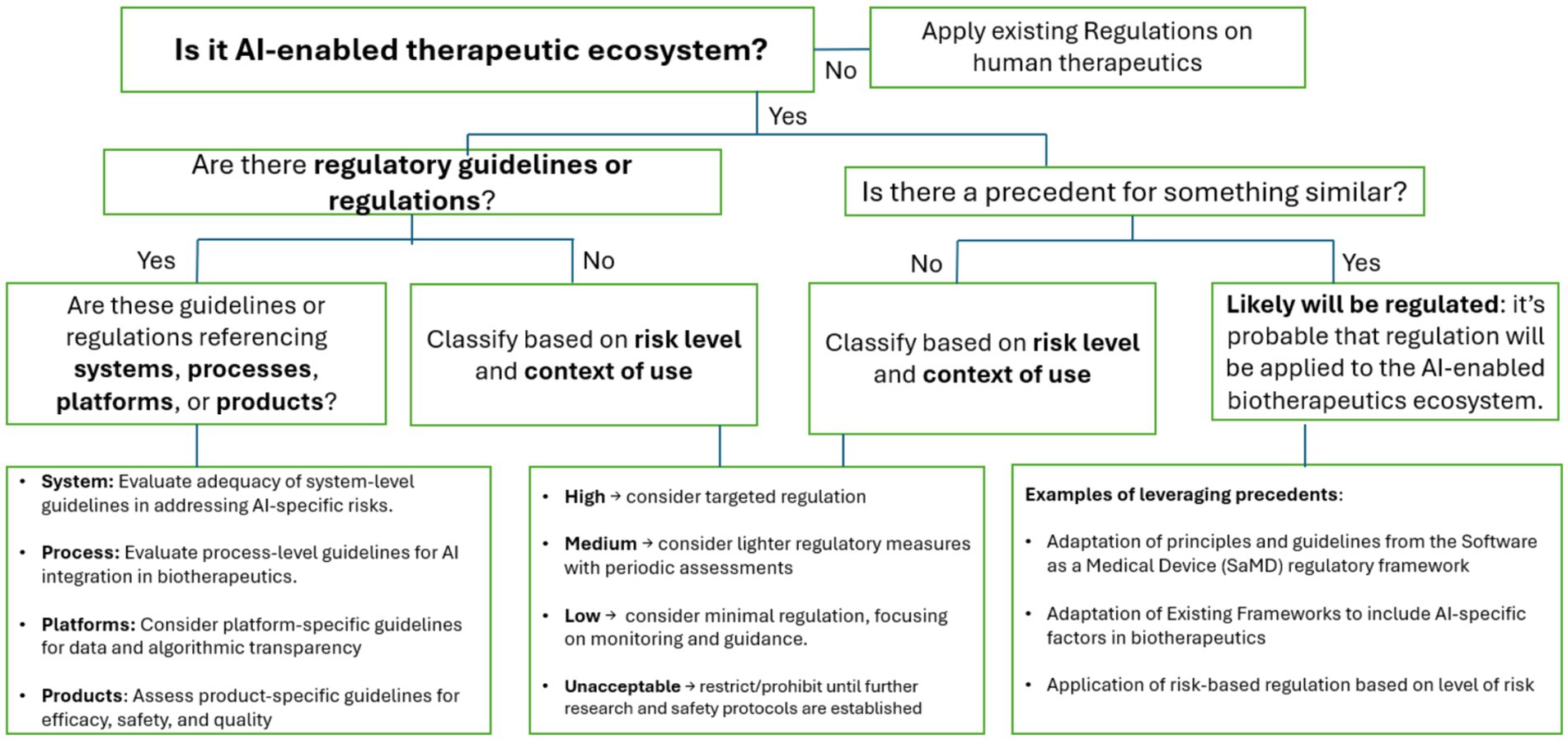 The framework begins by assessing whether existing guidelines apply and, if not, whether regulatory precedents such as FDA’s regulatory guidelines for AI/ML SaMD can be adapted. An example is the FDA’s principles of good machine learning practice (GMLP) applicable to the development of AI/ML-enabled medical devices. One principle is the application of good software engineering and security practices in the development of AI tools. Another principle is the monitoring of deployed models over time to maintain safety and performance. When no precedent exists, AI applications should be classified based on their context of use and potential risk to patient safety or product quality. Risk levels, categorized as high, medium, low, or unacceptable, then inform the appropriate degree of regulatory oversight, ranging from guidance to full premarket review. Figure 2 illustrates the regulatory decision-making process. By grounding regulatory decision-making in the context of use and oversight with potential risk, this framework offers a flexible yet rigorous approach to determining how to regulate, or not, the evolving landscape of AI-Enabled Ecosystem for Therapeutics.