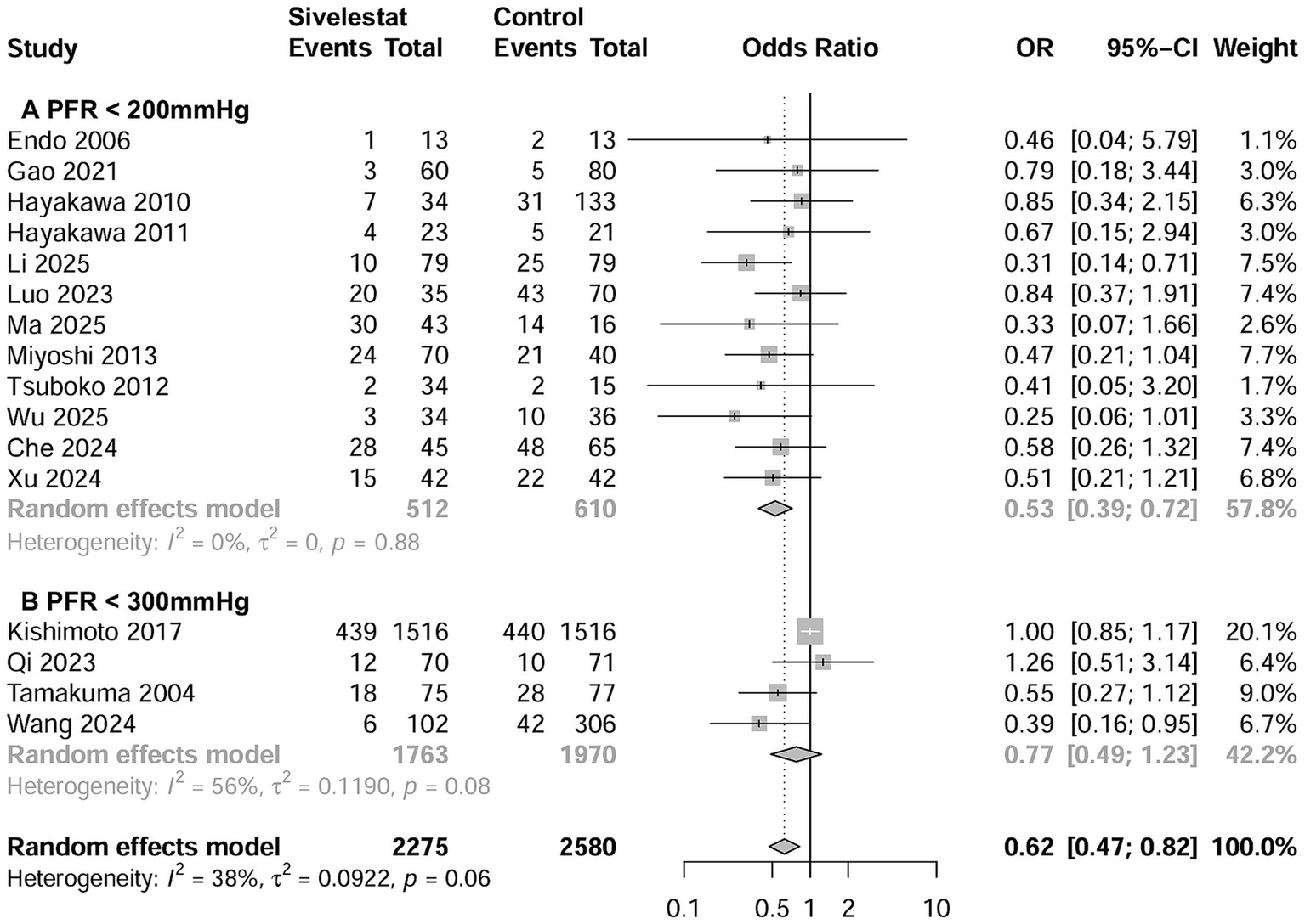 | Study characteristics | Studies number | Patient number | Event in sivelestat group | Event in control group | Odds ratio (95% CI) | I2 |
