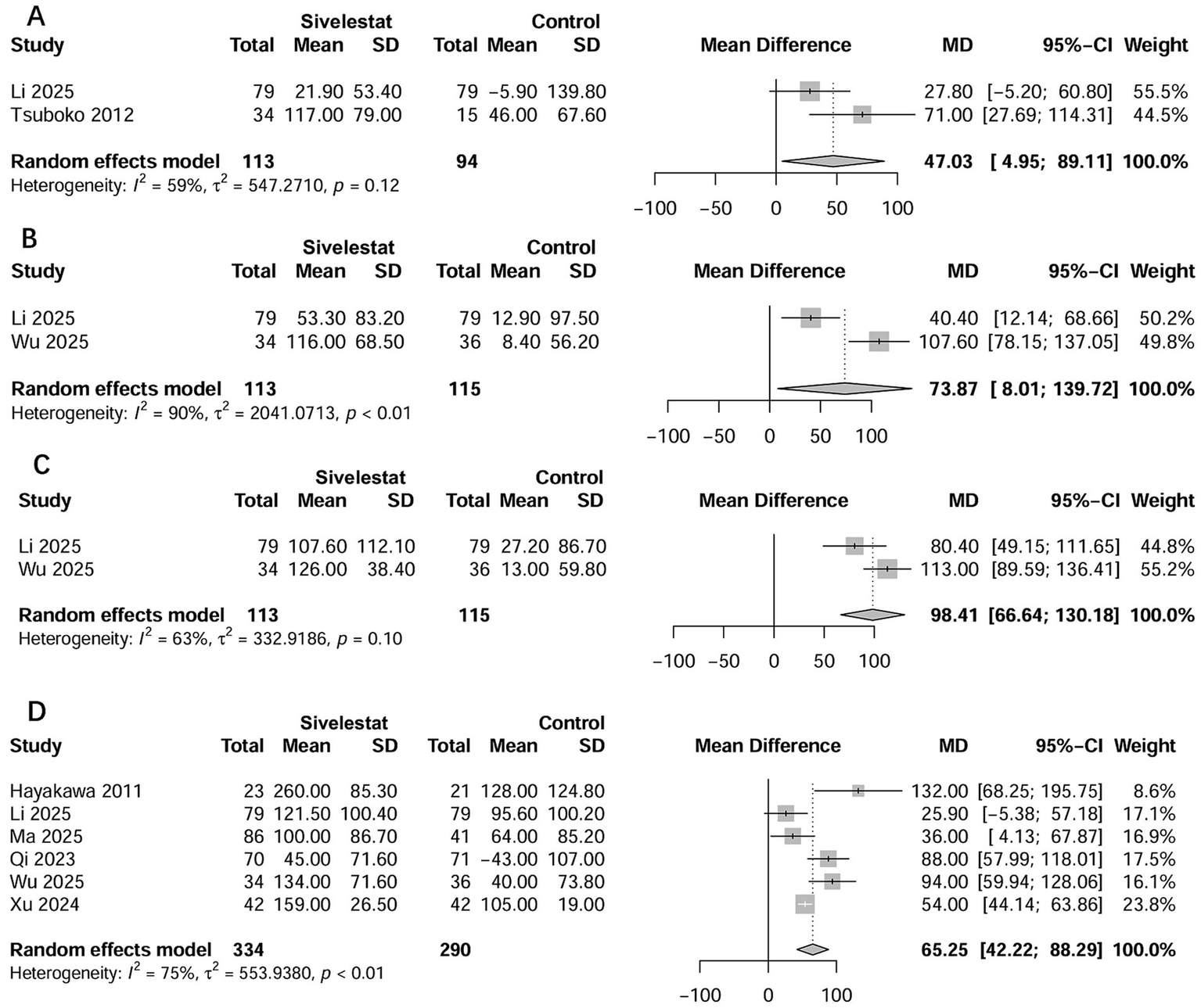 Forest plots of sivelestat on changes in PaO2/FiO2 at 1 day (A), 3 days (B), 5 days (C), and 7 days (D) after treatment.