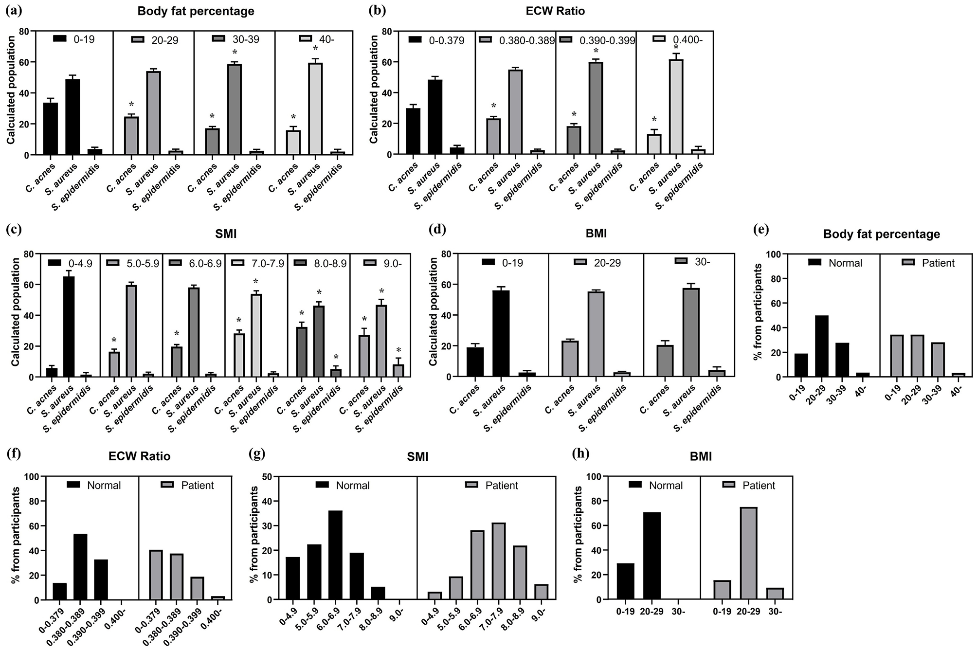Computed body composition analysis showed a correlation with bacterial abundance. Body fat percentage showed an inverse correlation with C. acnes and a positive correlation with S. aureus (Figure 6a). ECW ratio also showed this trend (Figure 6b). A high SMI was associated with higher C. acnes and S. epidermidis abundance, and lower S. aureus abundance (Figure 6e). BMI and WHR showed minimal effect on bacterial composition (Figures 6c, d).