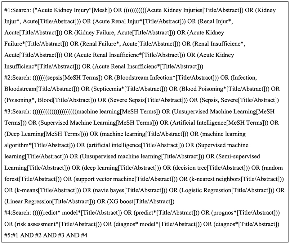 A systematic search was conducted across four databases: PubMed, Embase, Web of Science, and Cochrane Library. The search utilized a combination of terms including “Acute Kidney Injury/Acute Renal Injury/Acute Kidney Failure,” “Sepsis/Bloodstream Infection,” “Machine Learning/Artificial Intelligence/decision tree/random forest/support vector machine/k-nearest neighbors/k-means/naive bayes/Logistic Regression/Linear Regression/XGboost,” and “Prediction model/risk assessment.” Both subject headings and free-text keywords were employed. The search encompassed records from the inception of each database through March 2025. The search strategy is based on PubMed as an example (Figure 1). The detailed search strategy is provided in the Supplementary material.