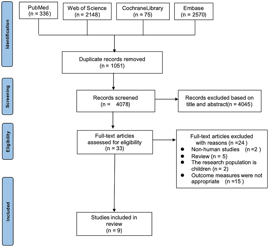 After the initial search, 5,129 documents were retrieved. Following the removal of duplicates using EndNote software, 4,078 documents remained. After further screening, 9 documents were ultimately included in the study. The literature screening process is depicted in Figure 2.