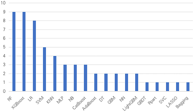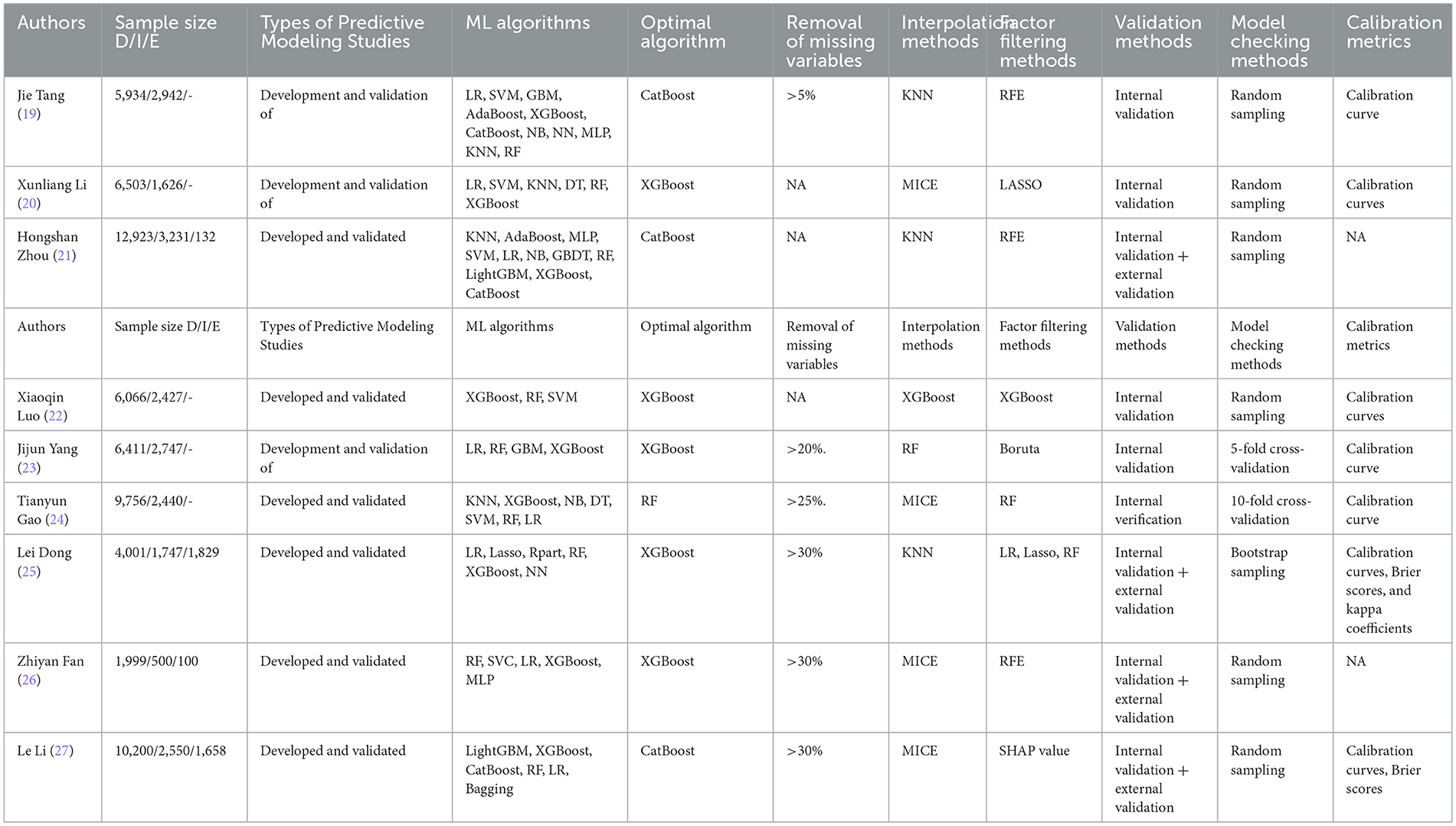 Among the nine included studies, details of the model construction are presented in Table 2. The training set sample size ranged from 1,999 to 12,923, the internal validation set sample size from 500 to 3,231, and the external validation set sample size from 100 to 3,471. All studies focused on developing and validating predictive models. Of these, five studies (19, 20, 22–24) conducted only internal validation, while the remaining four studies (21, 25–27) conducted external validation. The ML algorithms used are displayed in Figure 3, encompassing 18 types, including: Random Forest (RF), Extreme Gradient Boosting (XGBoost), Logistic Regression (LR), Support Vector Machine (SVM), K-Nearest Neighbors (KNN), Multilayer Perceptron (MLP), Naive Bayes (NB), Adaptive Boosting (AdaBoost), Categorical Boosting (CatBoost), Decision Tree (DT), Gradient Boosting Machine (GBM), Neural Network (NN), Gradient Boosting Decision Tree (GBDT), Light Gradient Boosting Machine (LightGBM), Recursive Partitioning and Regression Trees (Rpart), Support Vector Classifier (SVC), Least Absolute Shrinkage and Selection Operator (LASSO), and Bootstrap Aggregating (Bagging). Among these, RF and XGBoost were the most frequently used (n = 9), followed by LR (n = 8), SVM (n = 5), and KNN (n = 4). XGBoost exhibited the best predictive performance in five studies (20, 22, 23, 25, 26), CatBoost in three studies (19, 21, 27), and RF in one study (24). Six studies (19, 23–27) reported deleting missing variable values; three studies (19, 21, 25) used KNN for missing value imputation, four studies (20, 24, 26, 27) used Multiple Imputation by Chained Equations (MICE), one study (22) used XGBoost, and one study (23) used RF. Three studies (19, 21, 26) employed Recursive Feature Elimination (RFE) for predictor selection, two studies (20, 26) used LASSO, one study (22) used XGBoost, one study (23) used the Boruta algorithm, two studies (25, 26) used RF, one study (26) used LR, and one study (27) used SHAP values for factor selection. Among the nine included studies, except for two studies (21, 26) that did not mention calibration metrics, the remaining seven studies (19, 20, 22–25, 27) all utilized calibration curves as calibration metrics. Additionally, two studies (25, 27) employed the Brier score and Kappa coefficient for performance assessment.