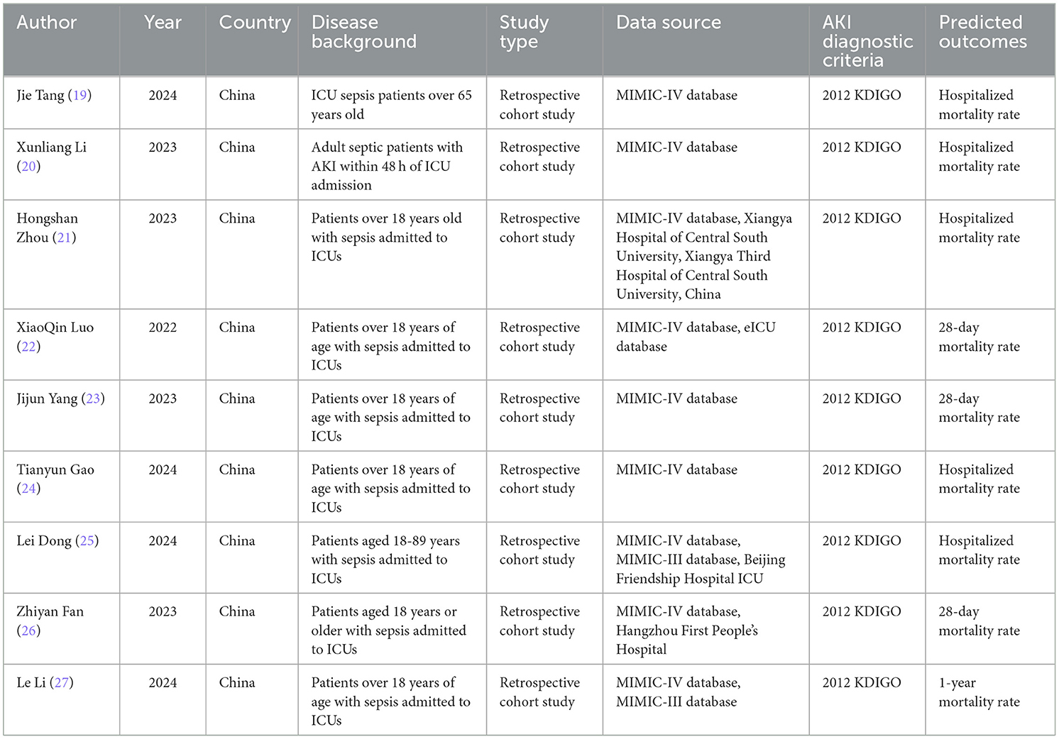Nine studies, published between 2022 and 2024, involved investigators all based in China. One study (19) focused on elderly patients aged 65 years or older, while eight studies (20–27) included adult patients aged 18 years and older. All were retrospective cohort studies. Data were sourced from public databases such as MIMIC-IV, MIMIC-III, eICU, and hospital electronic medical record systems. Five of the studies (19–21, 24, 25) examined in-hospital mortality outcomes, three studies (22, 23, 26) investigated mortality 28 days post-ICU admission, and one study (27) explored 1-year mortality outcomes. For additional details on the included literature, refer to Table 1.