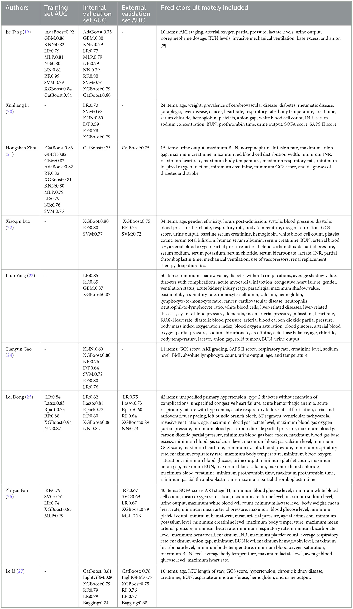 The nine studies encompassed in this investigation consistently reported the Area Under the Curve (AUC) scores for models utilizing the predictive factors outlined in Table 3. Distinct differences in model performance emerged between the training sets and the internal validation sets. For instance, in the study conducted by Tang (19), the RF training set achieved an AUC of 0.99, whereas the AUC for the internal validation set decreased to 0.80, suggesting an overfitting problem. Conversely, the XGBoost model analyzed by Dong exhibited robust performance, with AUC scores of 0.94 in the training set, 0.86 in the internal validation set, and 0.89 in the external validation set, indicating a strong generalization capability. Zhou et al.'s (21) CatBoost model displayed consistent stability across the training set (0.83), internal validation set (0.75), and external validation set (0.75). Regarding external validation, four studies (22, 25–27) provided results, with notable performances from Dong et al.'s (25) XGBoost at 0.89, Fan et al.'s (26) XGBoost at 0.79, and Li et al.'s (27) CatBoost at 0.78, whereas the external validation AUCs for other models predominantly fell below 0.8. The predictive factors incorporated in the final analysis were categorized into six groups: demographic information, vital signs, laboratory test indicators, disease severity, comorbidities, and treatment interventions. These factors included AKI stage, arterial oxygen partial pressure, lactate, urine output, norepinephrine (dose/injection rate), blood urea nitrogen (BUN), invasive mechanical ventilation, base excess, anion gap, age, weight, prevalence of cerebrovascular disease, diabetes, rheumatic disease, paraplegia, liver disease, cancer, heart rate, respiratory rate, body temperature, creatinine, serum chloride, hemoglobin, platelets, white blood cells, international normalized ratio (INR), serum sodium, prothrombin time, SOFA score, SAPS II score, red blood cell distribution width, inspired oxygen fraction, Glasgow Coma Scale (GCS) score, gender, race, hours post-admission, systolic blood pressure, diastolic blood pressure, oxygen saturation, serum total bilirubin, albumin, arterial blood carbon dioxide partial pressure, serum potassium, serum bicarbonate, partial thromboplastin time, mechanical ventilation, use of vasopressors, renal replacement therapy, loop diuretics, eosinophils, monocytes, lymphocyte-to-monocyte ratio, cardiovascular disease, neutrophils, neutrophil-to-lymphocyte ratio, dementia, mean arterial pressure, ROX-heart rate, hemoglobin concentration, ICU length of stay, hypertension, chronic kidney disease, aspartate aminotransferase, shadow value, acute myocardial infarction, congestive heart failure, atrial fibrillation, atrial and atrioventricular pacing, left bundle branch block, ST segment, ventricular tachycardia, BMI, oxygenation index, arterial blood pH.