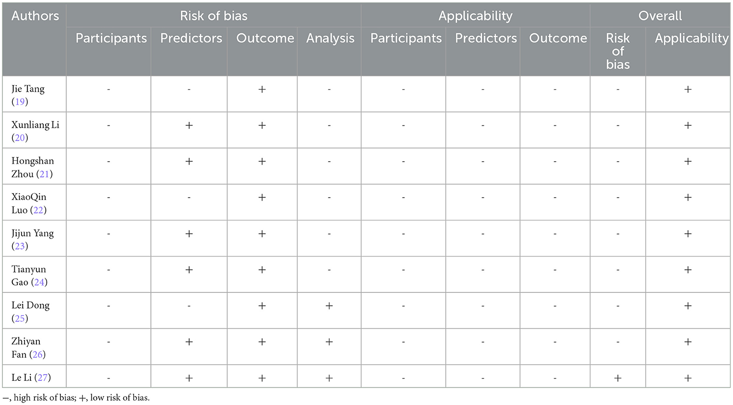 The assessment results of predictive model studies using PROBAST-AI indicated that nine studies exhibited a high overall bias risk in terms of bias risk assessment. Although these studies were retrospective and utilized data from publicly available large databases with adequate sample sizes and multi-center data, their risk in the areas of participants and data sources remained low. This was due to the clearly defined inclusion and exclusion criteria in the study design, ensuring low bias risk in these areas. In the predictive factor domain, the nine studies had clearly defined predictive factors and utilized various factor screening methods for preprocessing. The predictive factors were based on outcome data and were suitable for use in the intended application of the model. However, some studies (19, 22, 25) included treatment intervention factors such as invasive mechanical ventilation, renal replacement therapy, and vasoactive drug use. Including these factors in the prediction might introduce treatment-related bias, resulting in a high risk of bias in this domain. In the outcome indicator domain, outcomes were clearly defined and determined through hospital records within a clear time window, exhibiting no objective bias. All patients had clear outcome records with no loss to follow-up, leading to a low risk in the outcome indicator domain. In the statistical analysis domain, two studies (19, 20) were assessed to have a high risk of bias due to the use of only single-fold cross-validation during internal validation and the absence of cross-validation. Five studies (19, 20, 22–24) were considered to have a high bias risk due to the lack of external validation. Two studies (21, 26) conducted external data validation but were still deemed to have a high bias risk owing to the small sample size of the external validation data. Conversely, two studies (25, 27) used another large-sample database for external validation, which resulted in a low risk of bias. Additionally, two studies (21, 26) were rated as having a high risk of bias due to the absence of calibration metrics. Regarding overall applicability, the nine studies included populations consistent with the model's target population, utilized common predictive factors that matched the intended use, and predicted endpoint measures that were core indicators of S-AKI patient outcomes. Consequently, all were rated as having good applicability. The comprehensive results of the overall bias risk and applicability assessment for the included literature are detailed in Table 4.