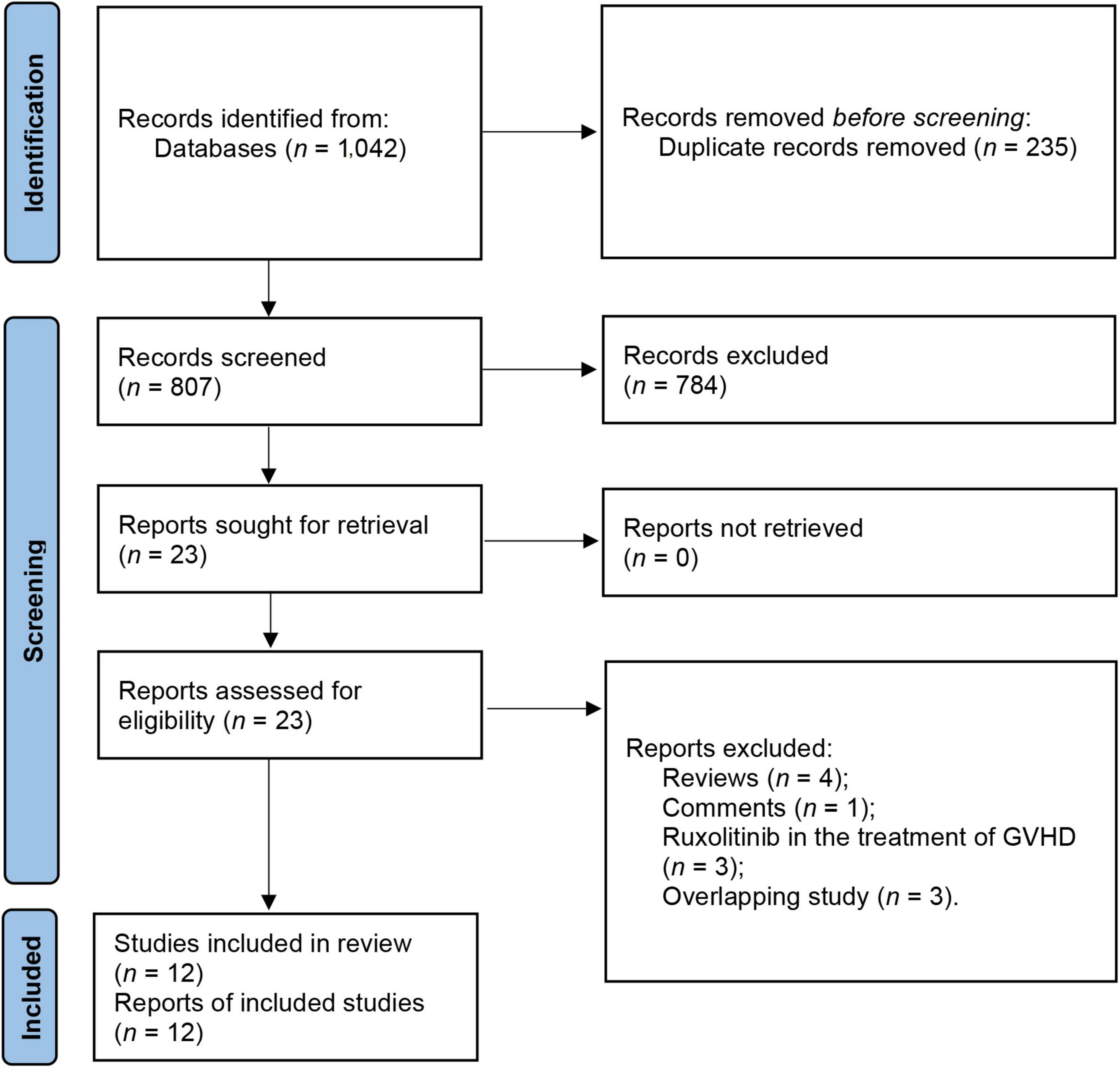 Two reviewers (C. Xie and L. Shi) independently assessed the titles and abstracts based on the inclusion criteria. Any discrepancies were resolved by involving a third reviewer (R. Liu). Afterward, they conducted a full-text review of the literature to make the final determination of eligibility. We used a standardized extraction form to extract information about the name of the first author, study design, year of publication, number of patients, age, gender, disease characteristics, treatment regimens, the dosage of ruxolitinib, and outcome parameters during the follow-up period. The outcome parameters comprised the incidence and severity of acute GVHD, chronic GVHD, overall survival (OS), CMV, and Epstein-Barr virus (EBV) reactivation.