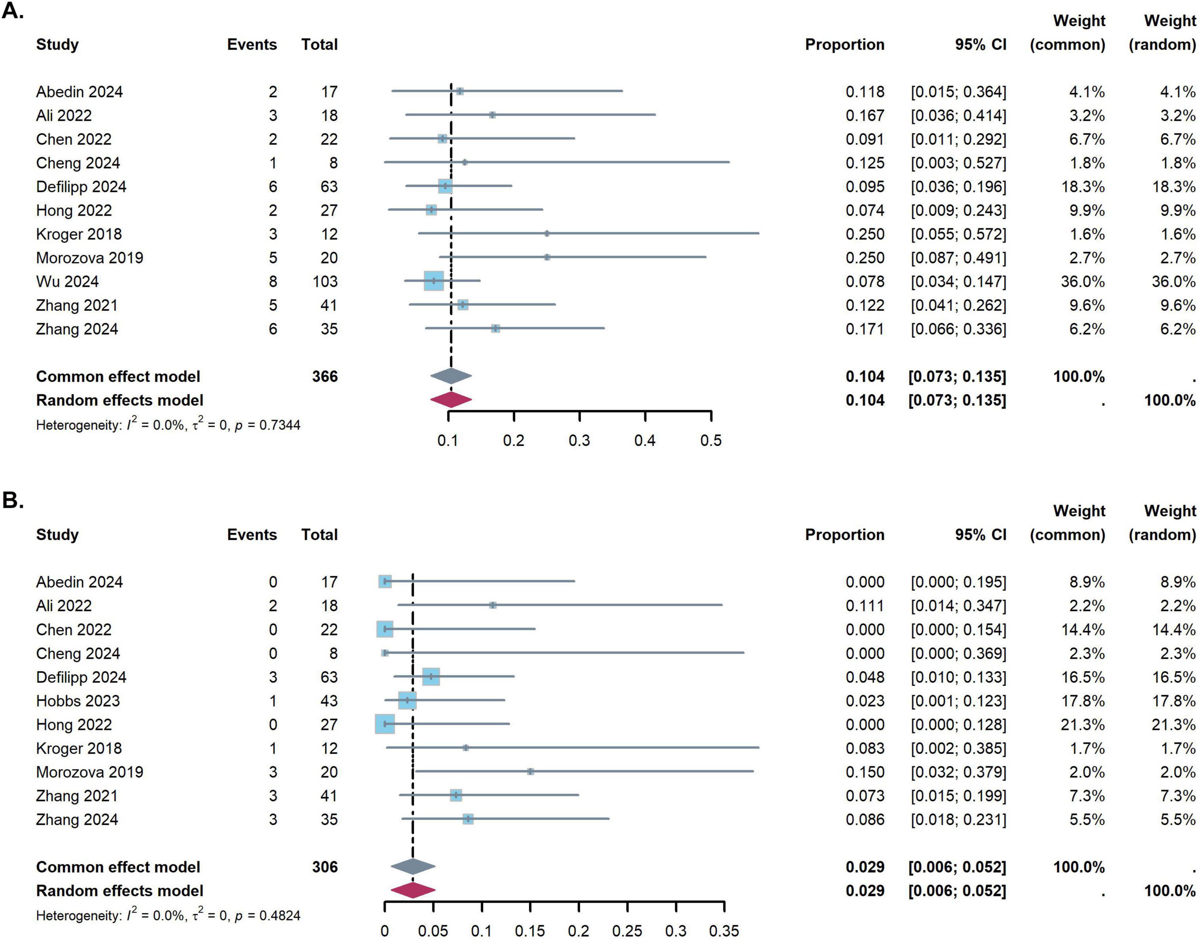 Figure 5. Forest plots for the pooled incidence of virus reactivation [(A) Cytomegalovirus reactivation, (B) Epstein-Barr virus reactivation].
