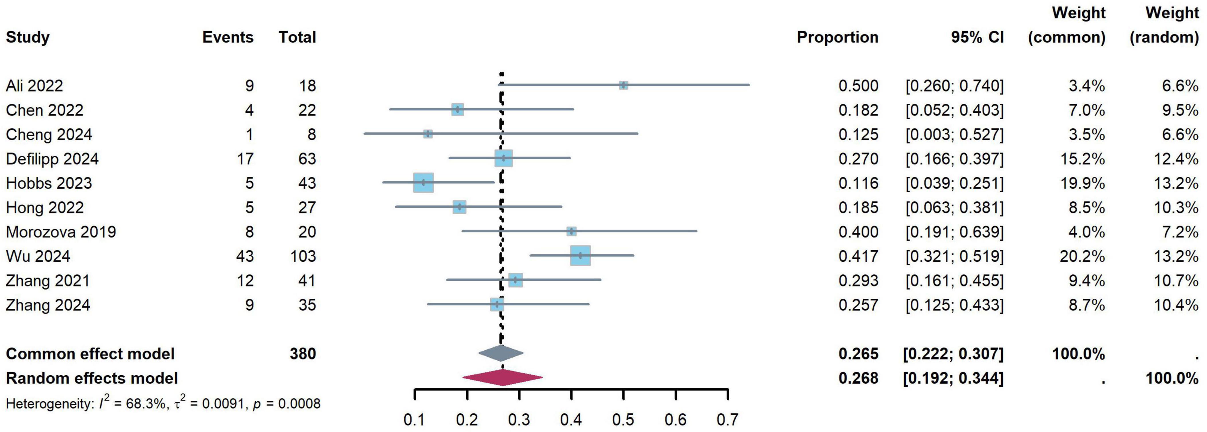 Data processing and statistical analysis were conducted using R software (version 4.4.2). A Cochran Q-test and I2 statistic were used to investigate heterogeneity. The pooled event proportions with their respective 95% confidence intervals (CIs) were calculated using a random or fixed-effects model. When heterogeneity was significant (p < 0.10 or I2 > 50%), a random effects model was adopted to pool the results. The meta-analysis results were visually presented using forest plots; if possible, with heterogeneity further investigated through subgroup and sensitivity analyses. The potential publication bias was scrutinized utilizing Egger’s test, with a p > 0.05, suggesting an absence of significant publication bias.