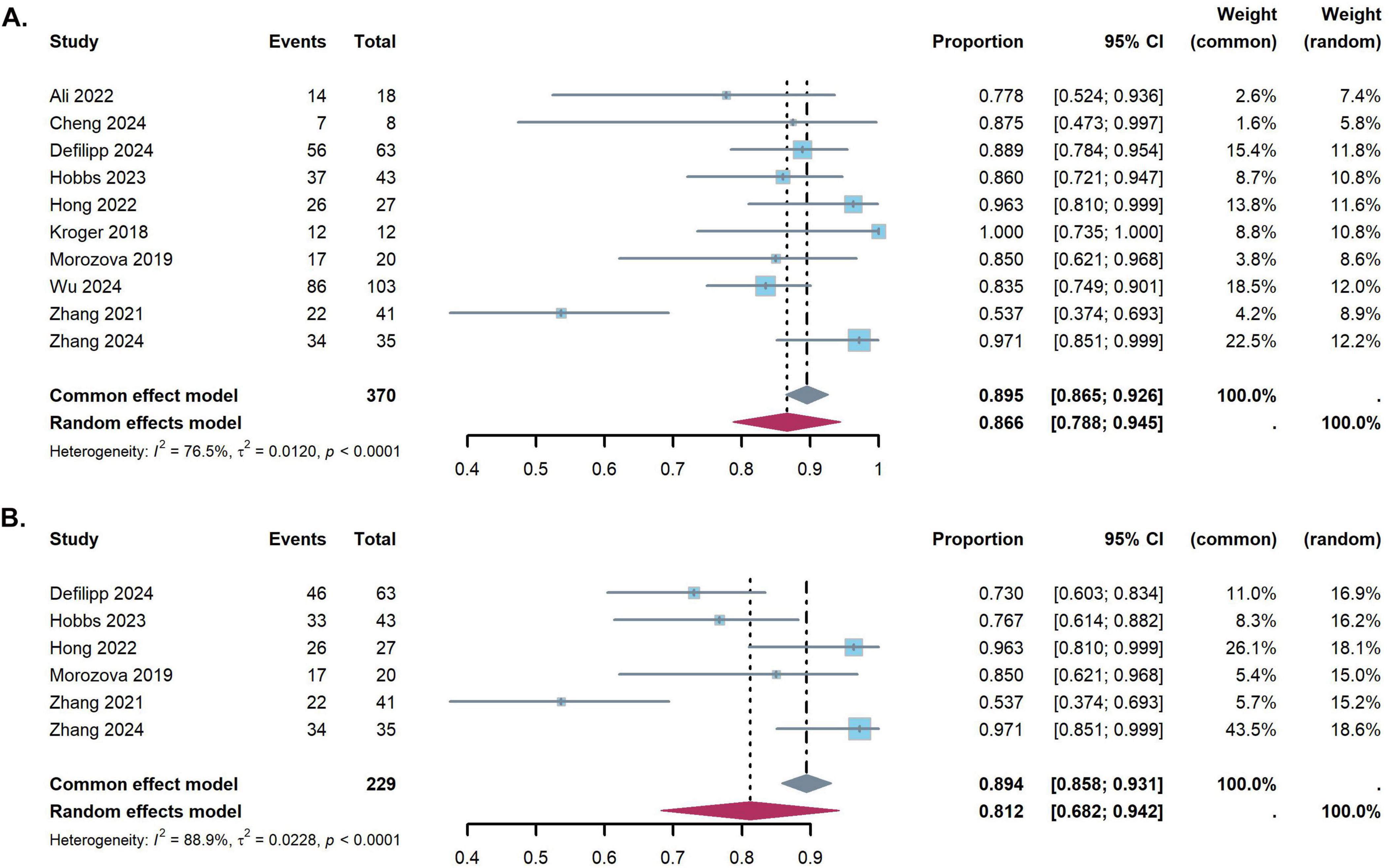Figure 4. Forest plots for the pooled incidence of overall survival (A) 1-year overall survival, (B) 2-year overall survival).