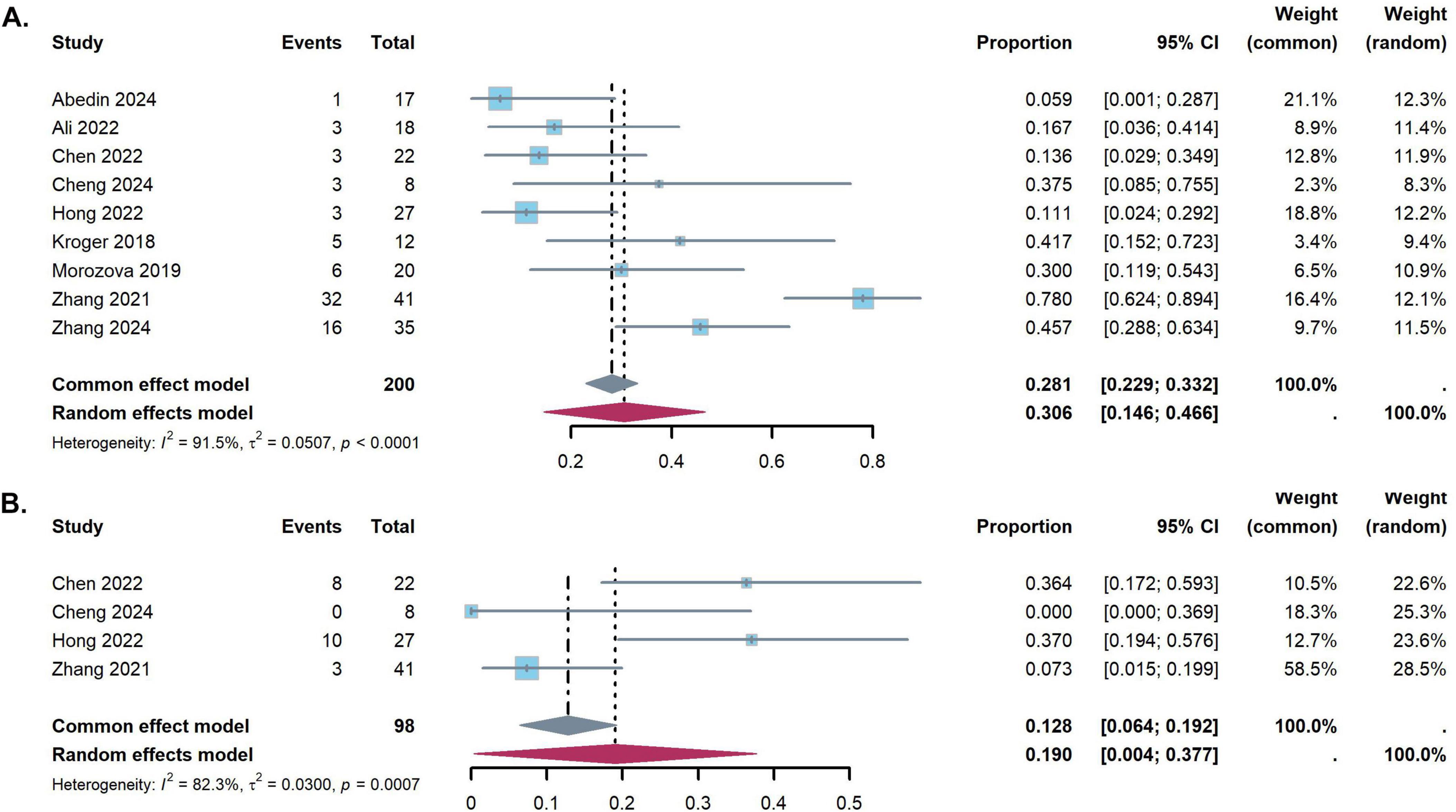The study revealed significant heterogeneity in CMV infection rate (I2 = 91.5%, p < 0.001). Random models were applied pooled results of CMV infection rate were 30.6% (95% CI: 14.6–46.6%) (Figure 5A). The pooled incidences of EBV infection were 19.0% (95% CI, 0.4 to 37.7%) (Figure 5B).