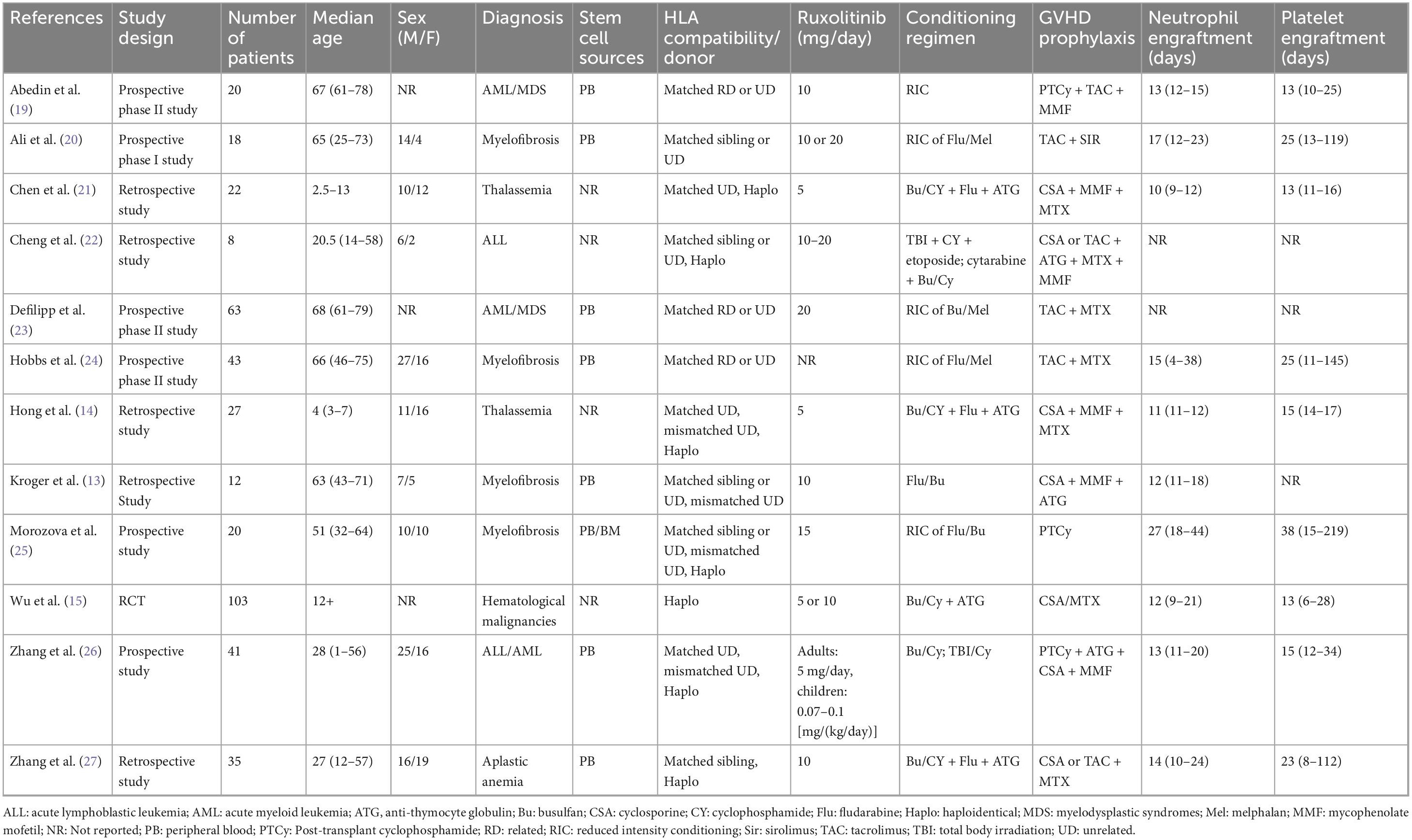 Recent advances in understanding the pathophysiology of GVHD have highlighted the critical role of the Janus kinase (JAK)–signal transducer and activator (STAT) of the transcription pathway. This pathway regulates the differentiation of T cells (7) and the production of inflammatory cytokines (8), which contribute to tissue inflammation and damage. Ruxolitinib, an oral JAK1/2 inhibitor, has demonstrated efficacy in the treatment of both acute and chronic steroid-refractory GVHD (9, 10). Preclinical studies have demonstrated that ruxolitinib effectively treats steroid-resistant GVHD while maintaining the GVL effect, with a favorable safety profile characterized by mild side effects (11, 12). Building on this success, clinical trials have begun to explore its potential as a prophylactic agent. Kroger et al. first demonstrated the efficacy of ruxolitinib in preventing acute GVHD in patients with myelofibrosis undergoing allo-HSCT (13). Their study revealed a markedly low incidence of grade II-IV acute GVHD at 8%, contrasting with a significantly elevated cytomegalovirus (CMV) reactivation rate of 41% in this cohort. Contrasting these findings, Hong et al. documented a 22.2% cumulative incidence of acute GVHD in ruxolitinib-treated patients, coupled with only 11.1% demonstrating clinically relevant CMV reactivation (14). Recently, Wu et al. established the efficacy of a low-dose ruxolitinib prophylactic regimen [combined with cyclosporine (CSA) and MTX] in achieving a marked reduction of grade II–IV acute GVHD, with an incidence rate of 7.8% (15).