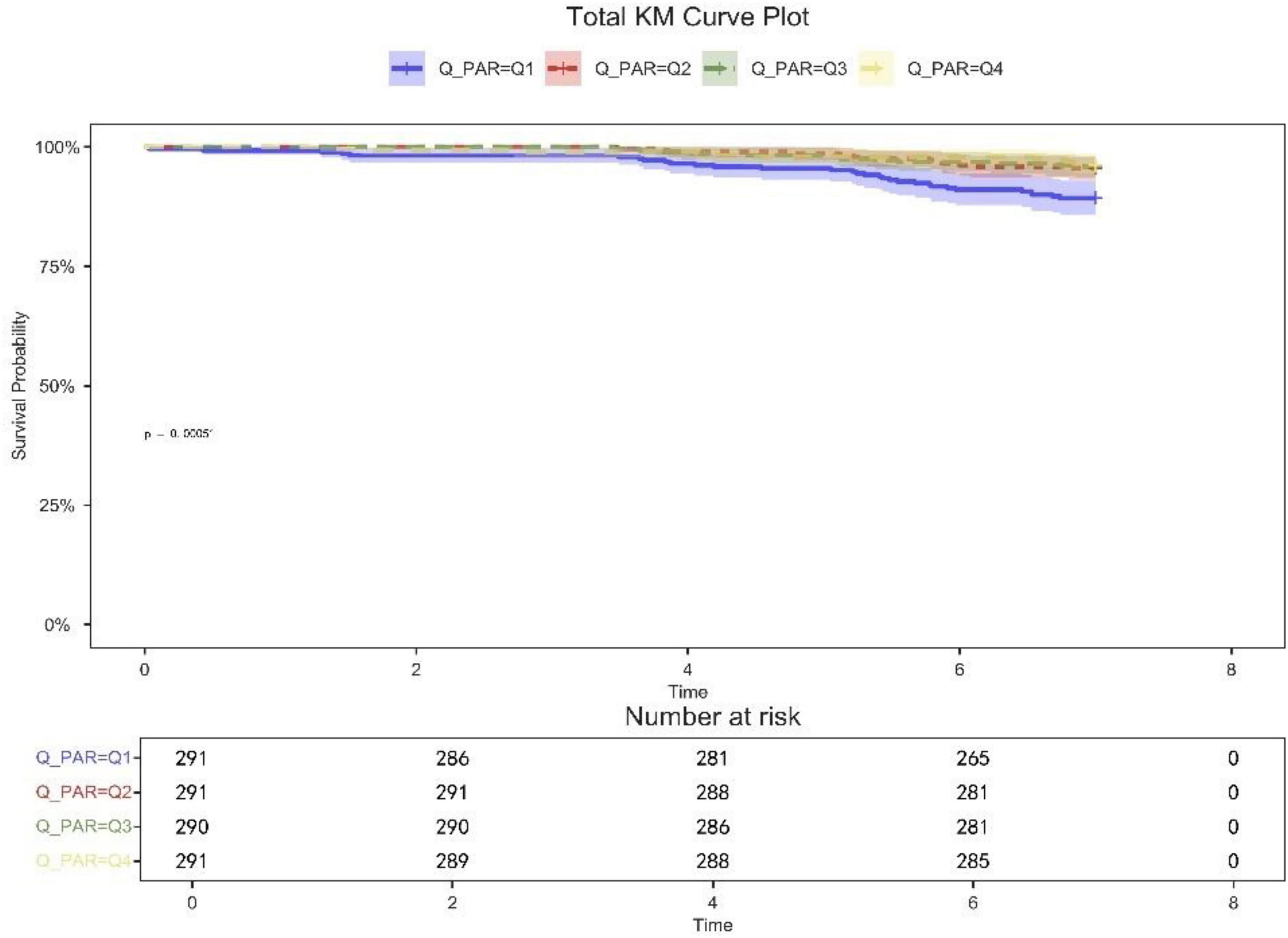 Table 2 shows that quartile 3 and 4 had the highest survival rates for 7-d, 14-d, and 28-d ICU stays. The Kaplan-Meier curve revealed that the mortality rate was notably higher in the low PAR group compared to the other groups (p < 0.001) (Figures 2–4).