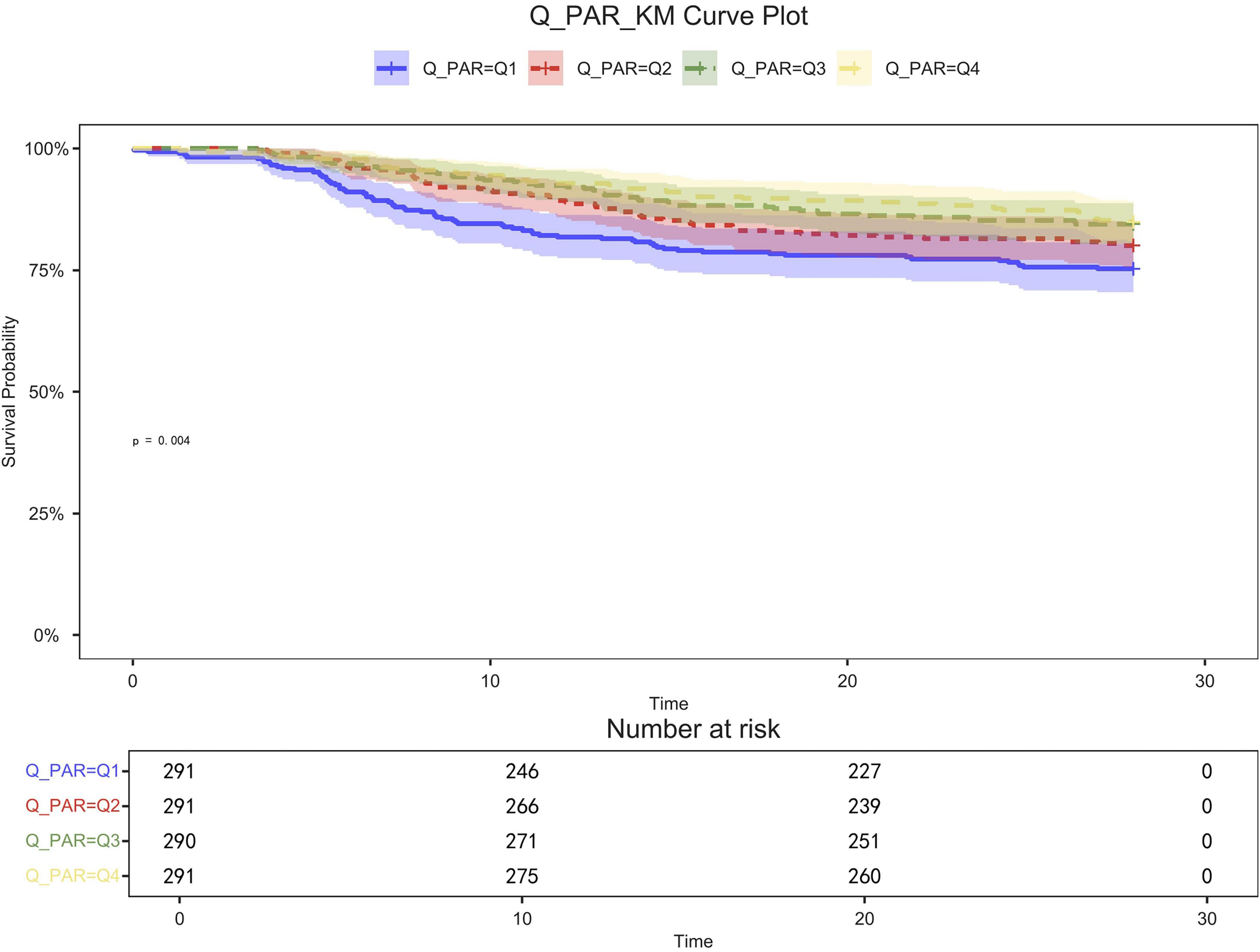 As the current study was a retrospective analysis, no sample size calculation was performed. Variables with missing data rates exceeding 20% were excluded, while multiple imputation was applied to variables with missing data rates below 20%. Patients were stratified into four groups based on PAR quartiles. Normally distributed continuous variables were expressed as mean (standard deviation [SD]) and analyzed using analysis of variance (ANOVA). Non-normally distributed variables were analyzed using the Mann-Whitney U test or Kruskal-Wallis test. Categorical variables were presented as numbers and percentages, and analyzed using the χ2 test or Fisher’s exact test. Kaplan-Meier survival curves with log-rank tests were used to compare 7-d,14-d,28-d survival rates across the four groups. Hazard ratios (HRs) and 95% confidence intervals (95% CIs) were evaluated using proportional hazards regression models (Cox regression models). Model I did not adjust for covariates. Model II adjusted for age, sex, and ethnicity. Model III further adjusted for additional relevant variables. Univariate Cox regression analysis was used to screen potential risk factors, and variables with p-values < 0.1 were included in subsequent multivariate Cox regression analysis. Restricted cubic spline (RCS) analysis was employed to assess non-linear associations of PAR. Subgroup analyses were conducted to examine the consistency of PAR effects across subgroups, with results presented as forest plots.