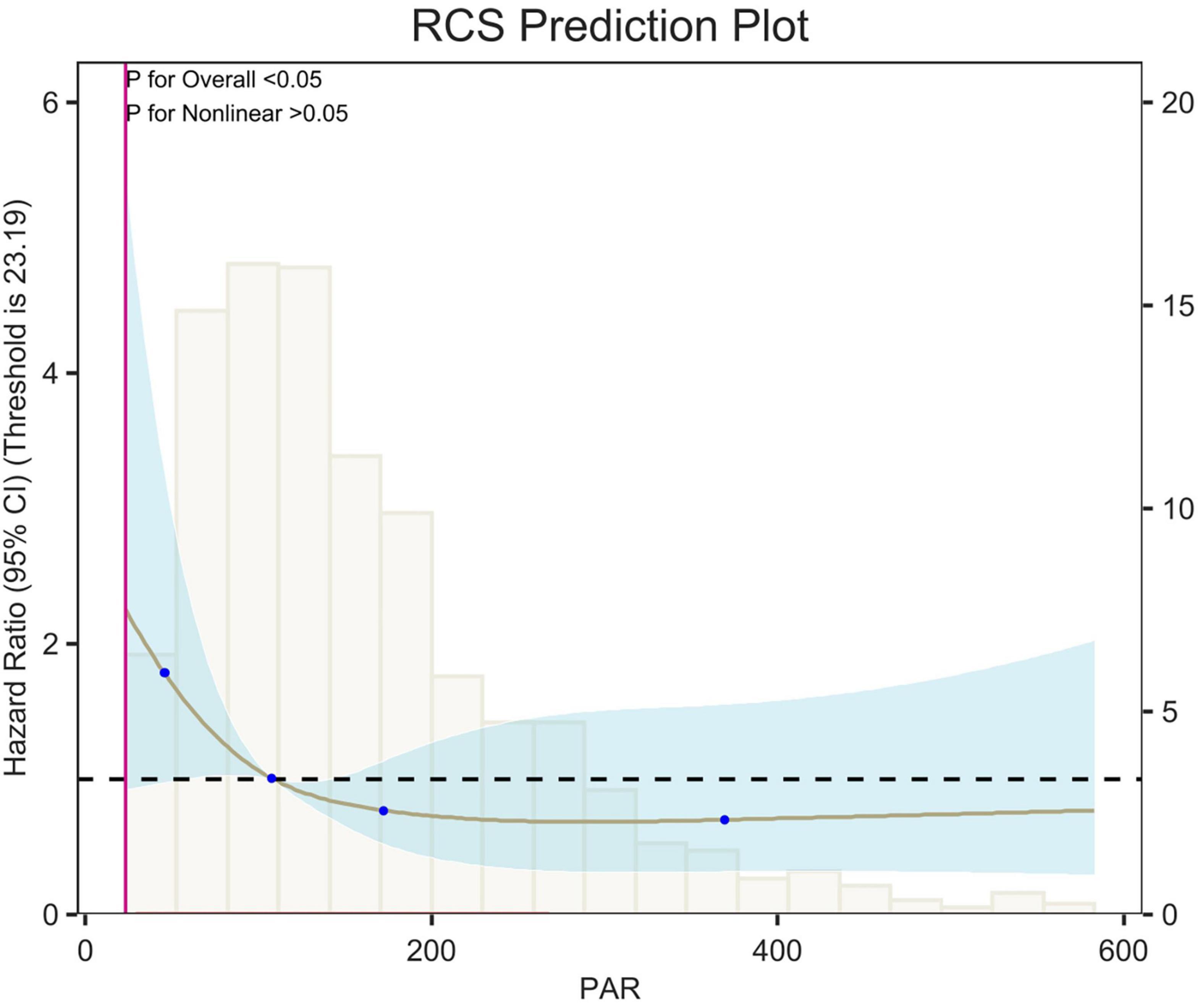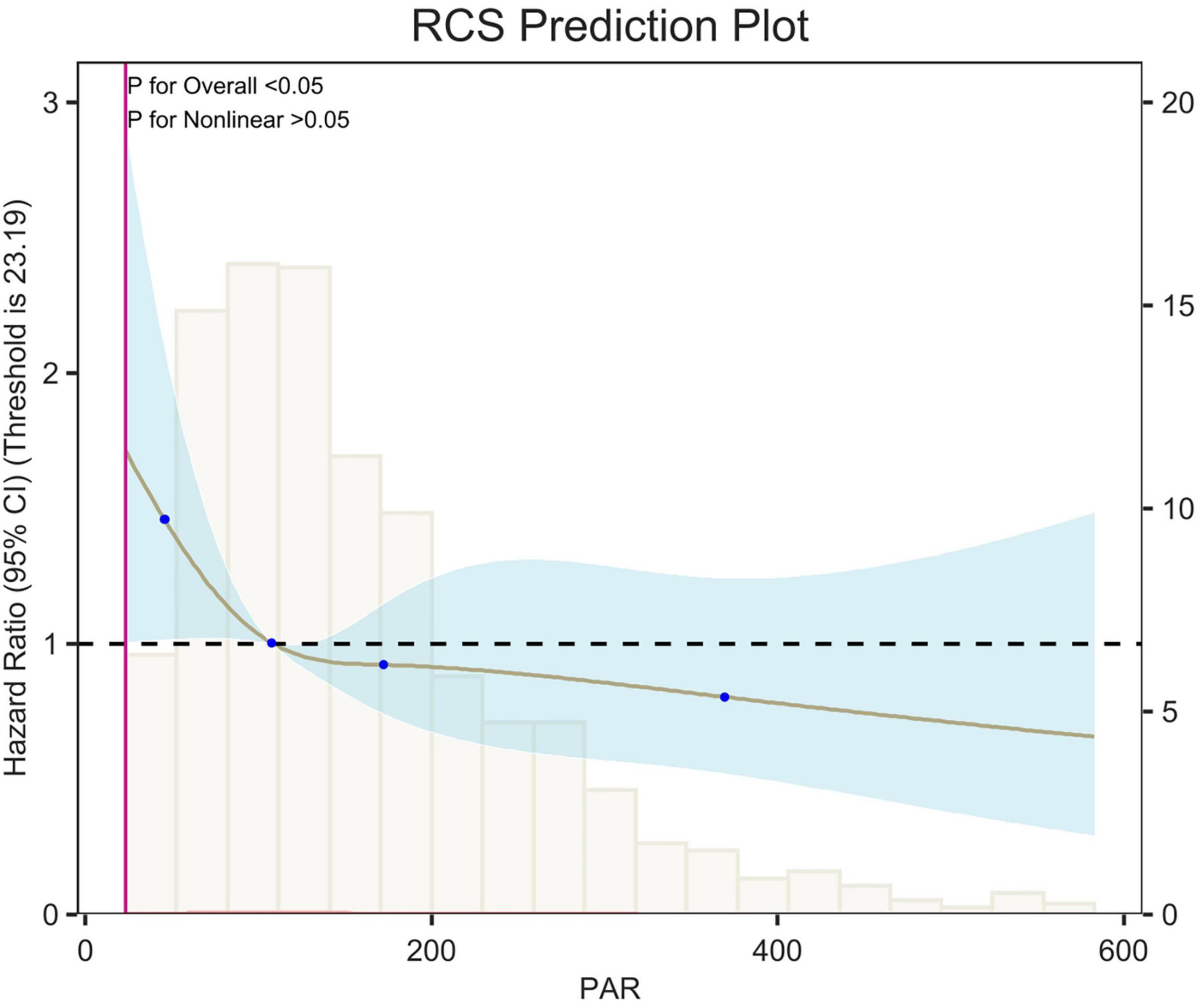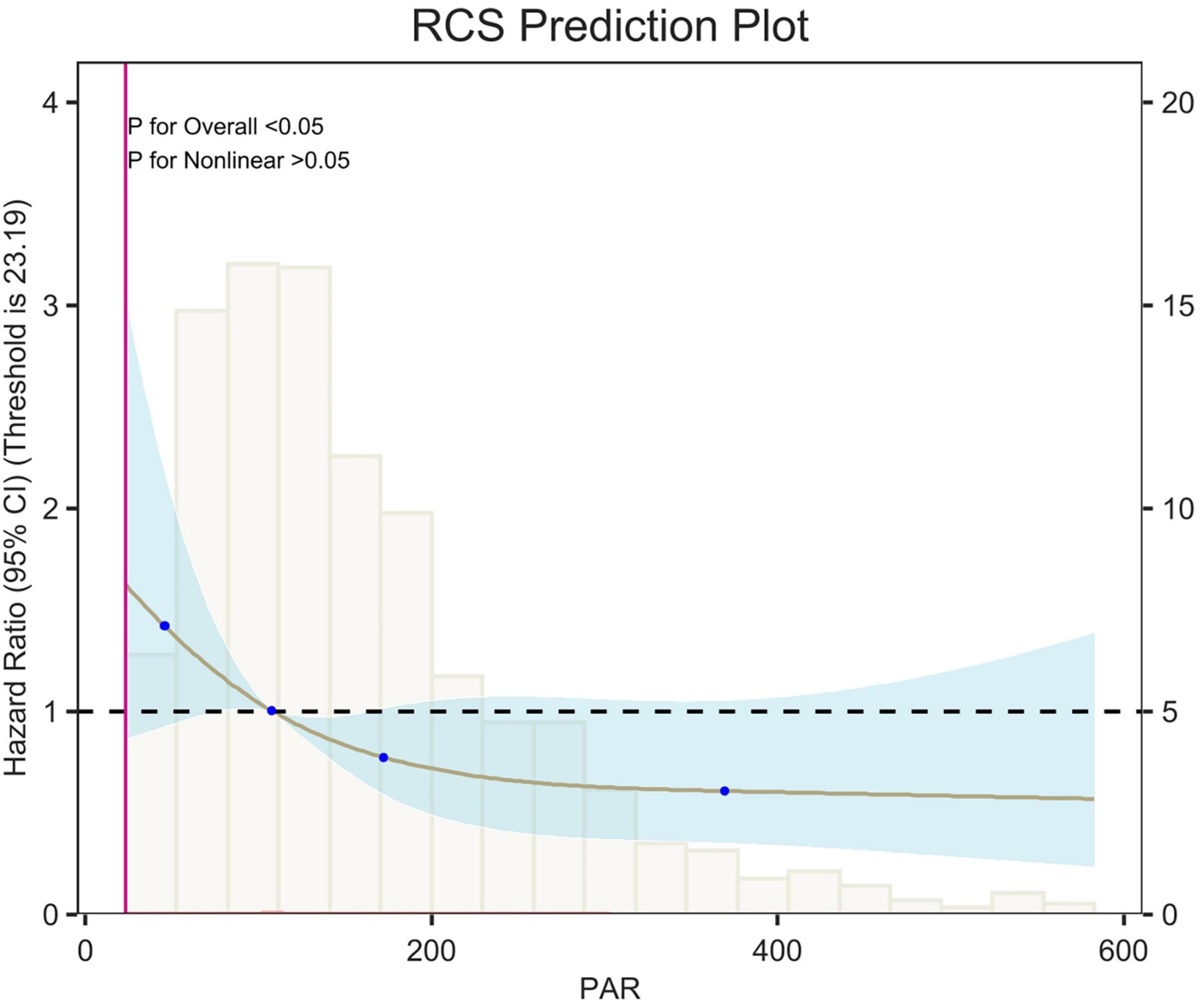 In this study, we collected data on survival (the outcome variable); the PAR (continuous predictor variable); and age, weight, sex and race. Potential linear relationships between the change in the PAR and survival were examined by a Cox regression model with restricted cubic spline (RCS). The model with the lowest Akaike information criterion value was selected for the RCS.