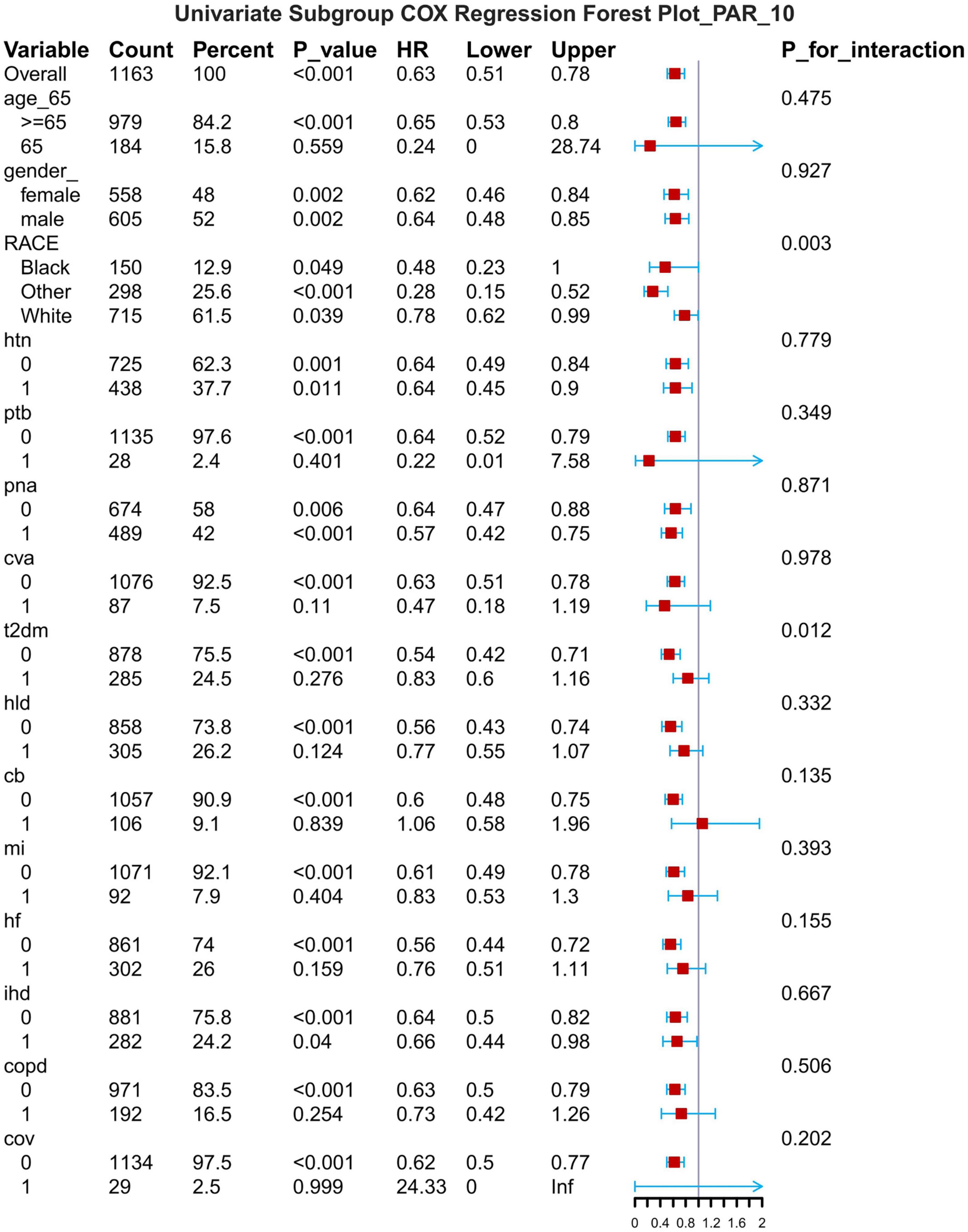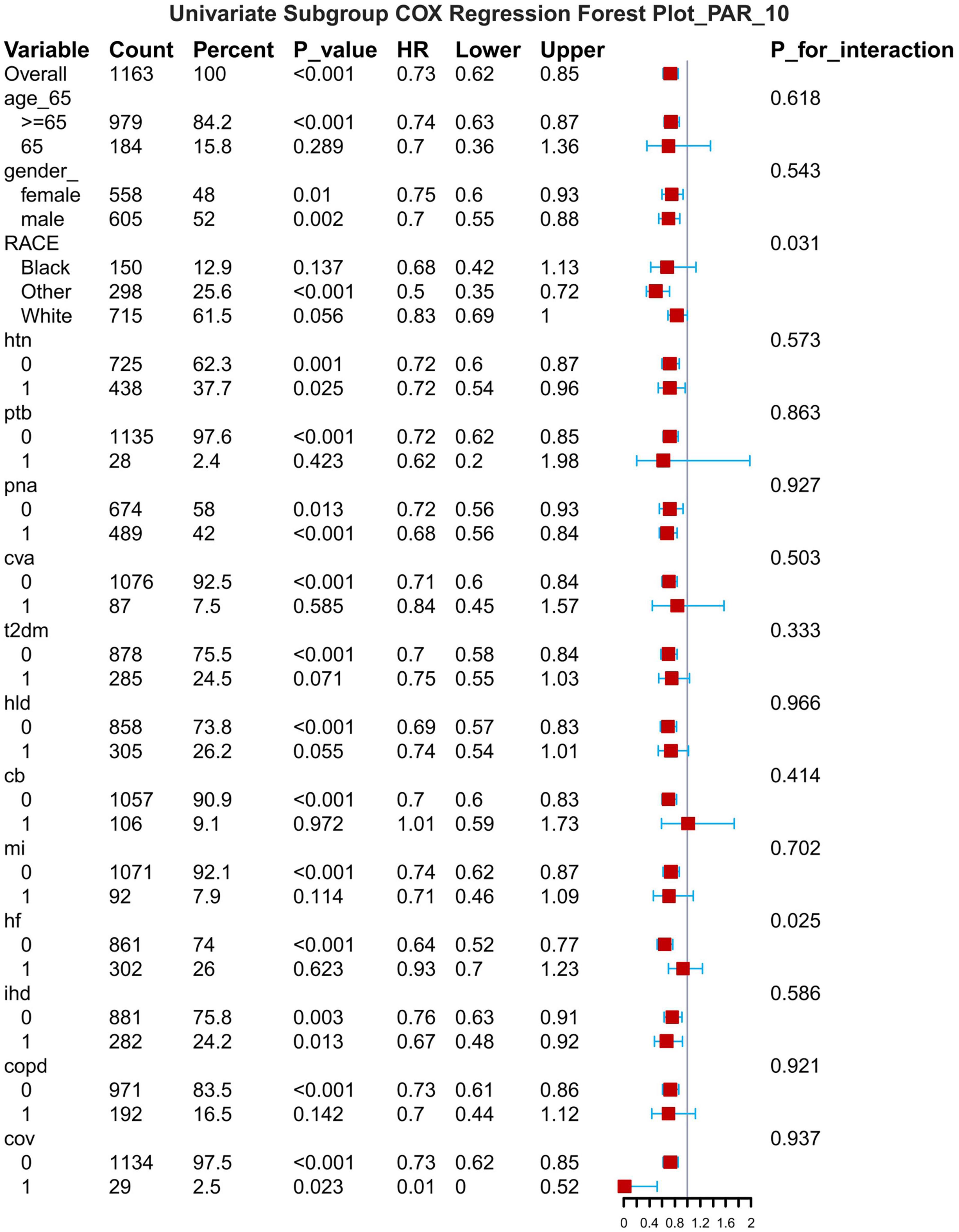 The results of the subgroup analyses are presented for 7-d, 14-d and 28-d all-cause mortality (Figures 8–10). In subgroups defined by age (under 65 years or over 65 years), sex (male or female), race, hypertension status and so on, PAR was significantly associated with the occurrence of outcomes.