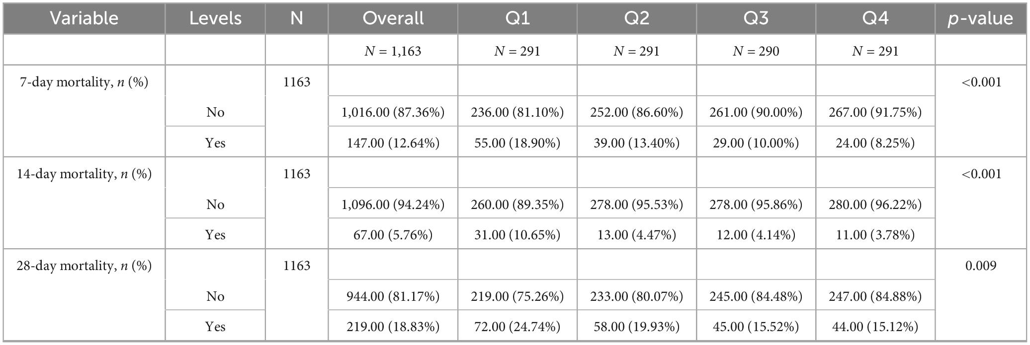 Data on 1163 patients diagnosed with pulmonary embolism were extracted from MIMIC-IV (Figure 1). Table 1 shows the baseline characteristics of the study population. The population included 605 males (52.02%), 438 patients with hypertension (37.66%), 28 patients with tuberculosis (2.41%), 489 patients with pneumonia (42.05%), 87 patients with stroke (7.48%), 285 patients with type 2 diabetes mellitus (24.51%), 17 patients with type 1 diabetes mellitus (1.46%), and 305 patients with hyperlipidemia (26.%), 106 patients with chronic bronchitis (9.11%), 302 patients with heart failure (25.97%), 92 patients with myocardial infarction (7.91%), 282 patients with coronary artery disease (24.25%), 192 patients with chronic obstructive pulmonary disease (16.51%), and 29 patients with coronary artery disease (2.49%). Patients were categorized into four groups according to quartile boxes: 291 patients in quartiles 1, 2, and 4; 290 patients in quartile 3. Patients in quartile 4 had higher WBC, Lactate, Glucose, pCO2, pO2, SOFA scores and heart rates, as well as lower ages, hematocrit levels, hemoglobin levels, Creatinine, PT, erythrocyte distribution width and PESI scores.