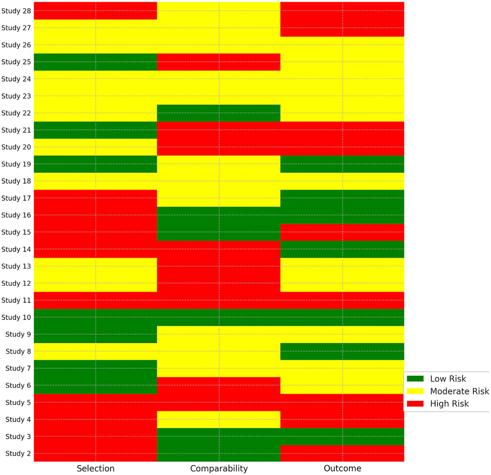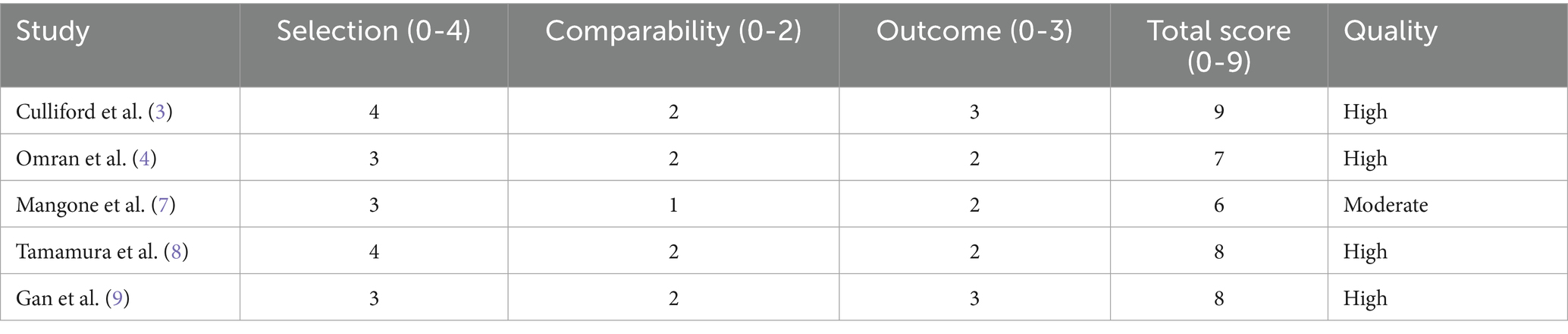 The risk of bias was evaluated using the Newcastle–Ottawa Scale (NOS). Of the five studies assessed, four studies received scores of ≥7, indicating high methodological quality. One study was rated moderate quality as it was unblinded and incompletely reported the results. A summary of scores for the NOS domains of each study (31, 32) (selection, comparability, and outcome) is reported in Table 2, and a graphical representation in Figure 1. Overall, the quality of studies indicates a methodical rigour.