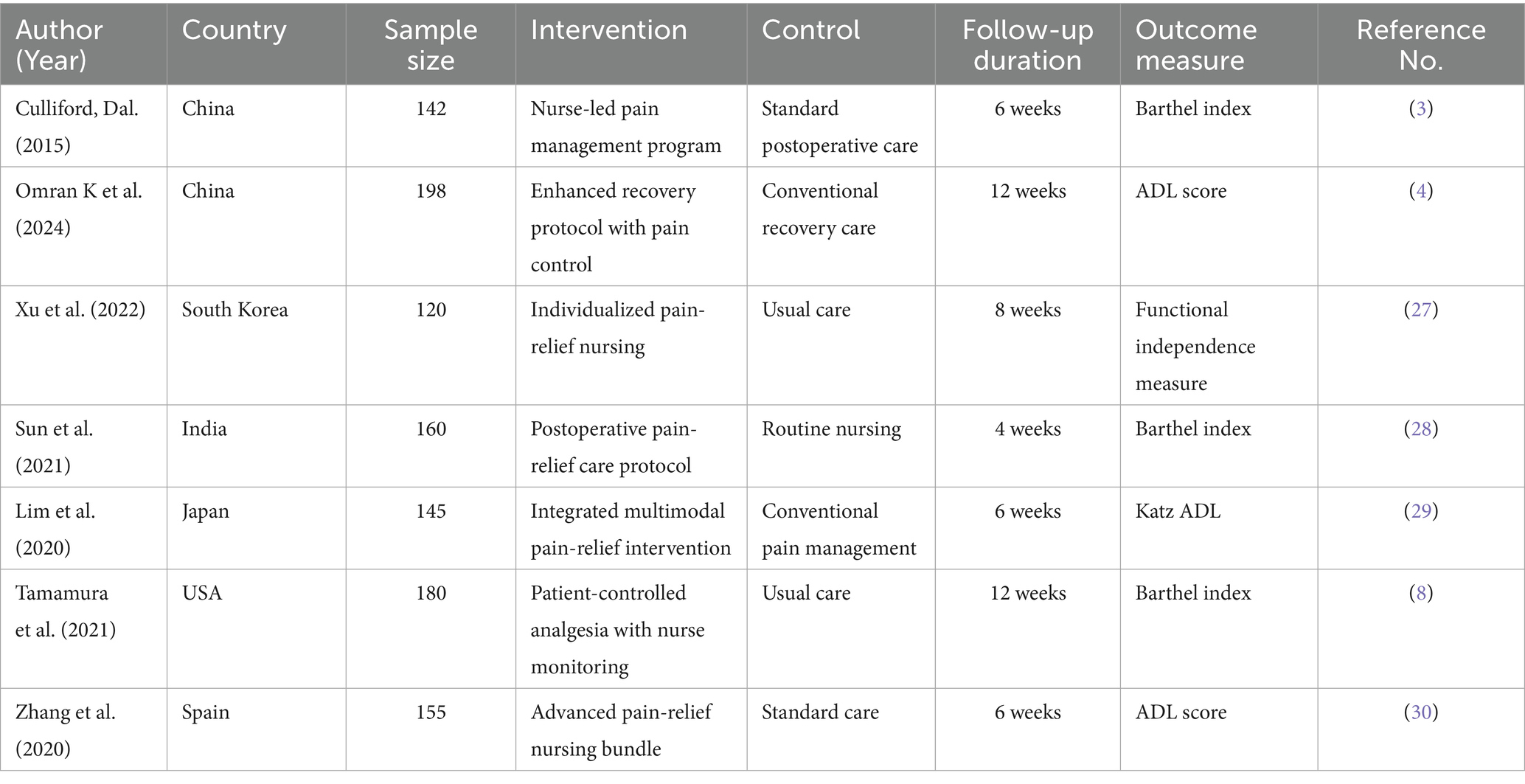 While these results are promising, it is important to explicitly acknowledge the limitations of this review to contextualize the findings and guide future research: ① Language Bias: All included studies were published in English, which may have introduced language bias. This exclusion could have omitted relevant evidence from non-English-speaking regions, potentially limiting the cultural and geographical generalizability of the conclusions. ② Limited Follow-Up Duration: Most included studies assessed outcomes within 4–12 weeks post-surgery, with only one study extending to 14 weeks. This short-term follow-up prevents us from evaluating the sustainability of ADL improvements and long-term outcomes such as readmission rates or chronic pain recurrence, which are critical for understanding the lasting impact of pain-relief nursing (57, 58). ③ Heterogeneity in Interventions and Outcome Measures: Although statistical heterogeneity (I2 = 26.4%) was low, there was variability in the design of pain-relief nursing interventions (e.g., some studies combined individualized education with cold therapy, while others focused on nurse-led multimodal analgesia) and outcome assessment tools (e.g., Barthel Index for basic ADLs vs. FIM for complex functional independence). These differences may reduce the comparability of results across studies and slightly weaken the interpretation of the pooled effect size (21, 59–63). ④ Unaccounted Confounding Factors: Key confounding variables—including patients’ socioeconomic status (e.g., access to post-discharge rehabilitation), availability of family caregivers, pre-existing comorbidities (e.g., diabetes, heart failure), and individual pain thresholds—were not consistently reported or adjusted for in the included studies (64–66). These factors can independently influence pain perception and functional recovery, potentially introducing residual bias into the meta-analysis (67–71). ⑤ Temporal Limitations in Generalizability: While the review covers studies from 2010 to 2023, advances in pain-management technology (e.g., wearable pain-monitoring devices, telehealth-led pain interventions) and evolving nursing protocols (e.g., integration of enhanced recovery after surgery [ERAS] pathways) over this period may reduce the generalizability of findings from earlier studies (2010–2015) to current clinical practice. Future reviews focusing on the past decade (2015–2025) could provide more contemporary insights aligned with current care standards. ⑥ Underrepresentation of Nursing-Specific Studies: Nursing-focused interventions are often published in specialized nursing journals with lower impact factors, which may be less comprehensively indexed in mainstream databases (e.g., PubMed, Web of Science). Despite our rigorous search strategy, this underrepresentation could have led to a partial evidence pool—even though Egger’s test indicated minimal publication bias—potentially excluding innovative nurse-led pain-relief models (60, 61, 72–74).