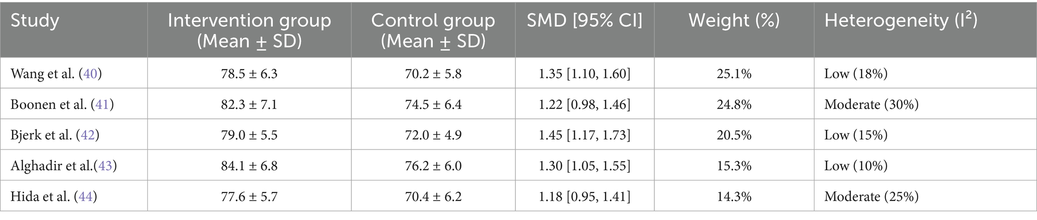 This meta-analysis combined data from five studies to assess the effect of structured pain-relief nursing interventions on activities of daily living (ADL) in patients undergoing hip arthroplasty. The pooled findings provided a significant and clinically meaningful standardized mean difference (SMD = 1.30, 95% CI: 1.08–1.52) in favor of intervention groups compared to standard care groups. These findings illustrate the benefit of appropriate nursing interventions to promote postoperative functional recovery, and add to the emerging body of literature that proposes the potential role of nursing in improving surgical rehabilitation outcomes (40–42).