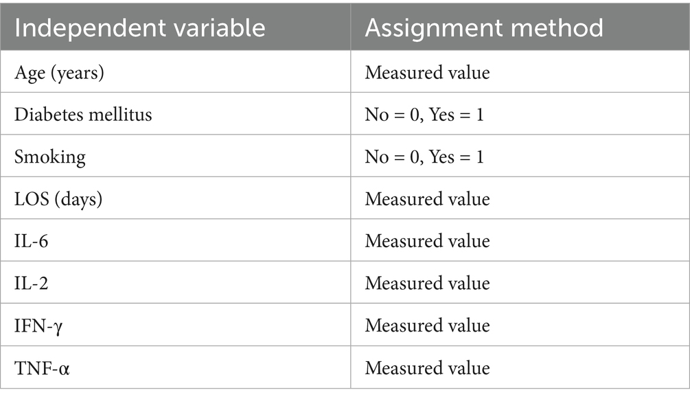Variables with significant differences in univariate analysis (age, diabetes prevalence, smoking history, LOS, IL-6, IFN-γ, TNF-α, and IL-2) were included in a non-conditional binary logistic regression model, with pulmonary infection status as the dependent variable (0 = control, 1 = infection group). The model was optimized using backward stepwise elimination, and variable assignments are detailed in Table 3. The analysis identified advanced age, prolonged LOS, elevated IL-6, and increased TNF-α as independent risk factors for pulmonary infection (p < 0.05). In contrast, higher IL-2 levels were associated with protective effects (p < 0.05). Complete results are presented in Figure 1.