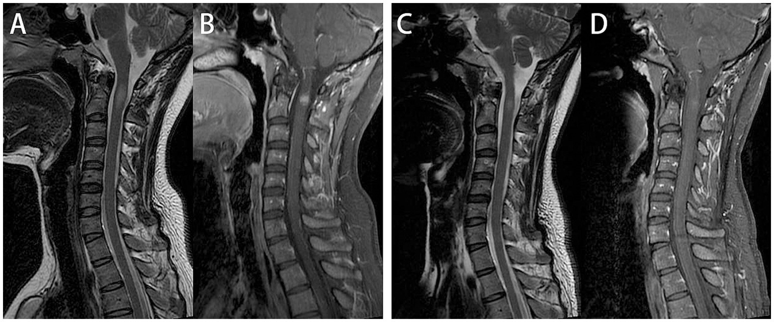 Cervical spinal cord plain and enhanced magnetic resonance imaging (MRI). On admission, cervical spine MRI demonstrated intramedullary abnormal signals at the C2 level, with nodular uniform enhancement (A,B). One month later, follow-up cervical spine MRI showed that One month later, follow-up cervical spine MRI showed that a significant reduction in both the extent of the T2WI hyperintense and enhancing lesions (C,D).