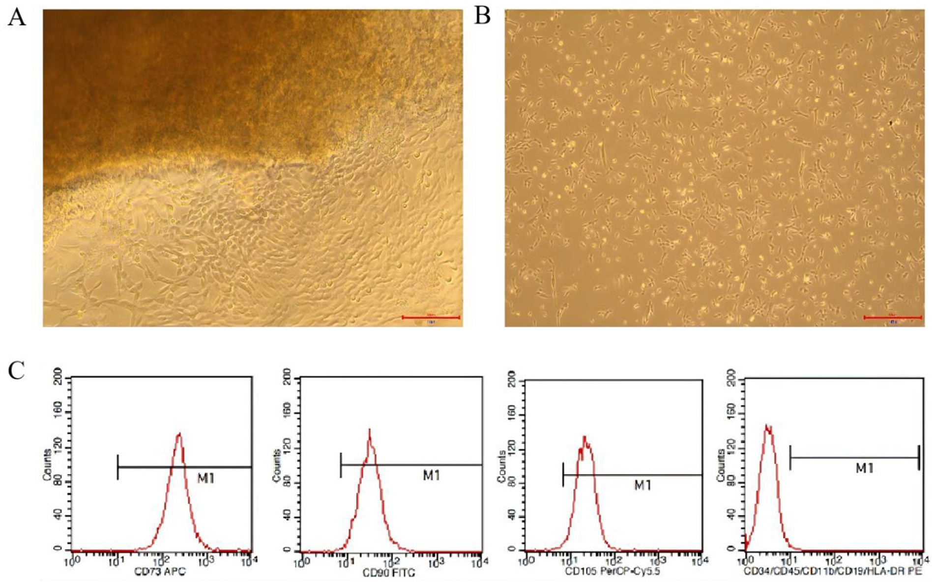 Figure 1. Isolation, culture and identification of hUC-MSCs. (A) Primary hUC-MSCs morphology. (B) Passage 2 hUC-MSCs morphology. (C) Flow cytometry analysis results of hUC-MSCs.