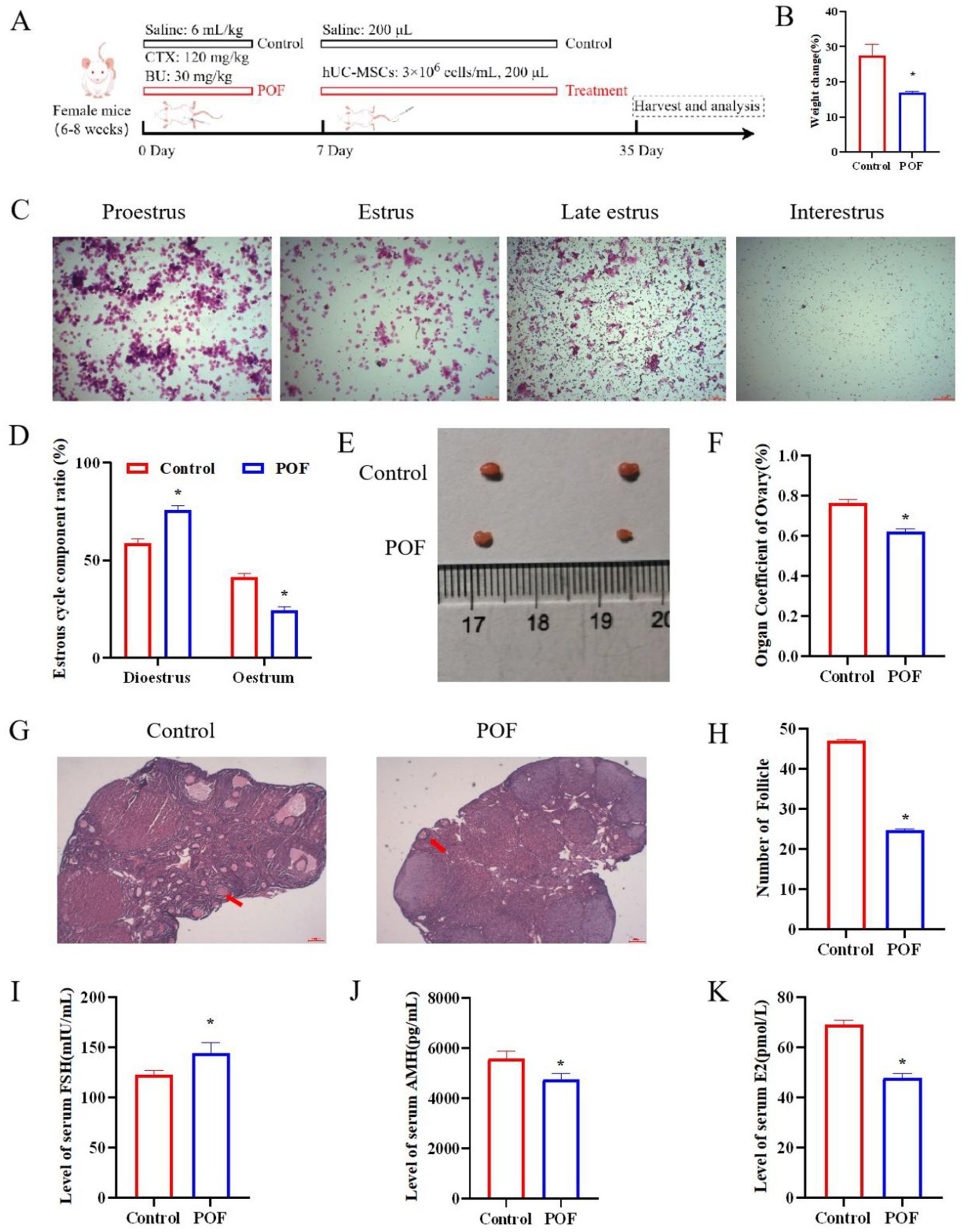 Figure 2. Effect of CTX combined with BU on ovary structure and function in mice. (A) Animal experiment design. Mice were intraperitoneally injected with CTX (120 mg/kg) and BU (30 mg/kg), 1 week later, hUC-MSCs (3×106 cells/mL, 200 μL) were injected via the tail vein, while control mice were given saline. (B) Changes in the body weight of mice in each group during the experiment. (C,F) The estrous cycle of mice. Proestrus: the nucleated cells are round, the nucleus is dyed purple red, the cytoplasm is dyed rose red, and there are rose red non-nucleated keratinocytes; estrus: rose red keratinized cells, irregular polygon shape; Late estrus: a large number of white blood cells and a small number of non-nuclear keratinocytes; Interestrus: leukocytes, nucleated cells and non-nucleated keratinocytes exist simultaneously. (D,H) H&E staining and number of follicles. (E,G) Representative images of ovary and organ coefficient. (I–K) Serum E2, FSH and AMH content in control and POF mice. Data are presented as mean ± SEM (n = 3). *p < 0.05 vs. the control group.