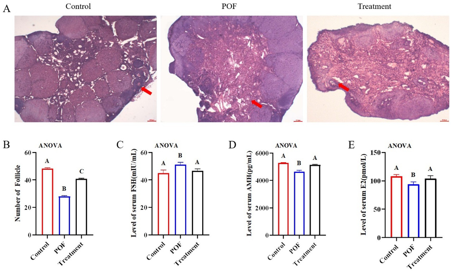 Histological sections show ovarian tissue from control, POF (premature ovarian failure), and treatment groups, each labeled with an arrow. Below, bar graphs illustrate ANOVA results comparing three groups on the number of follicles, serum FSH, AMH, and E2 levels. Graphs indicate statistically significant differences, marked by different letters above bars.