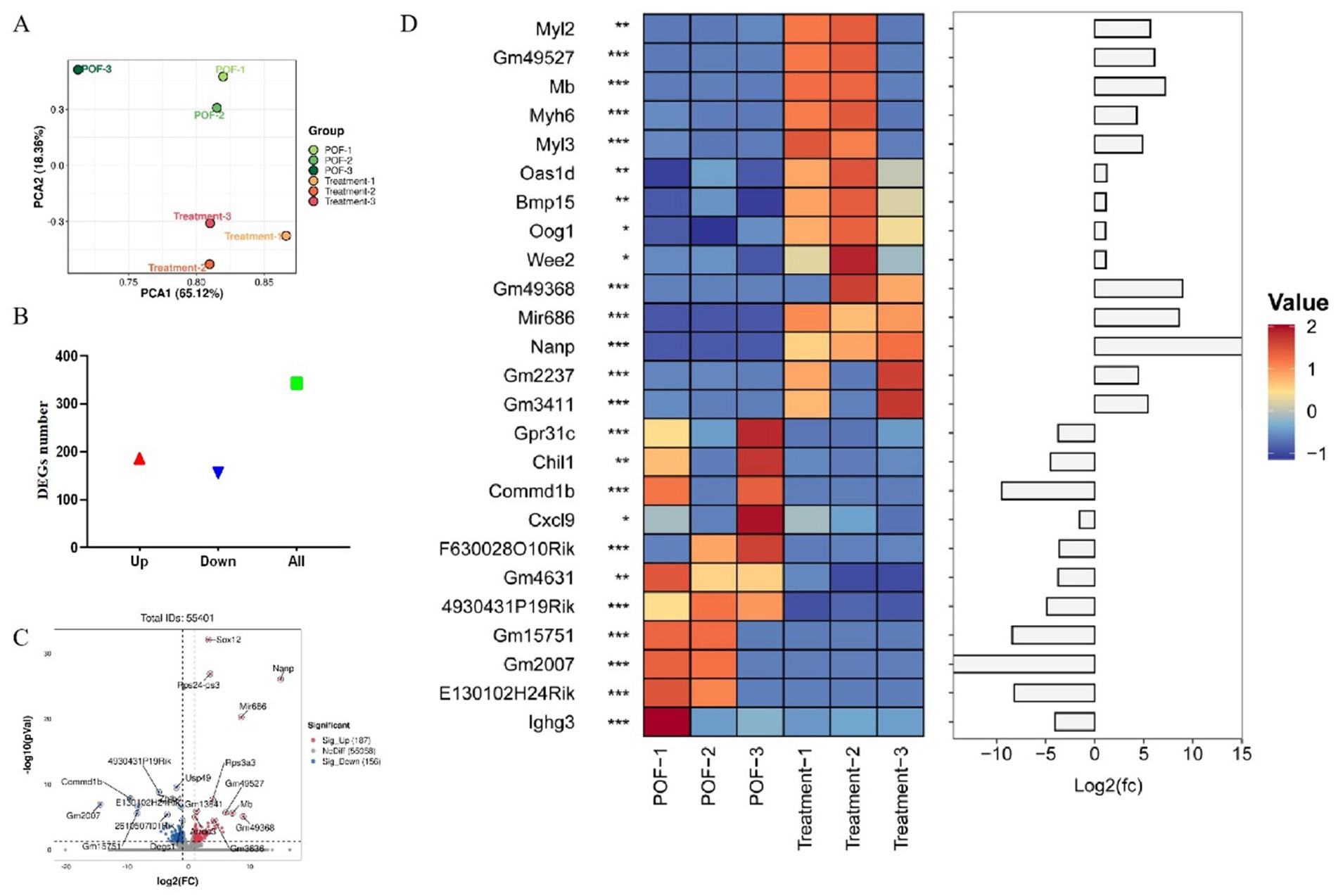 Figure 4. DEGs analysis based on RNA sequencing of mouse ovary. (A) PCA analysis of RNA sequencing in each group. (B) Histogram of up or down-regulated DEGs. (C) Volcano map of DEGs screening based on RNA sequencing. (D) Heat map of relative mRNA levels of relative genes of mouse ovary.