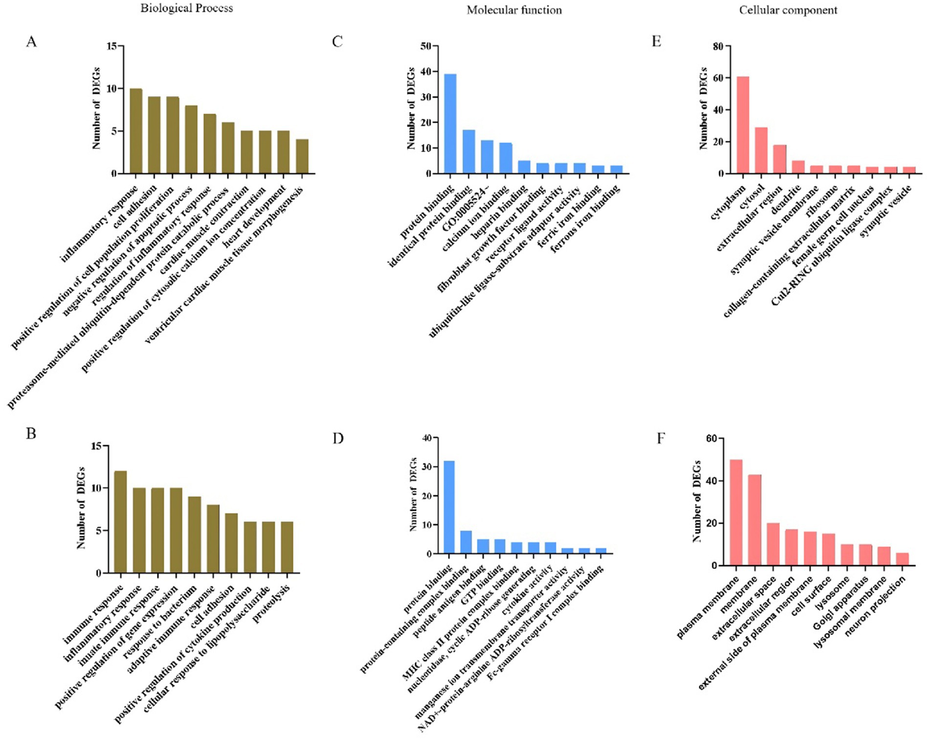 Figure 5. GO enrichment analysis for biological process, molecular function and cellular component of DEGs. (A–C) Top10 GO terms of up-regulated differential genes. (D–F) Top10 of GO terms of down-regulated differential genes.