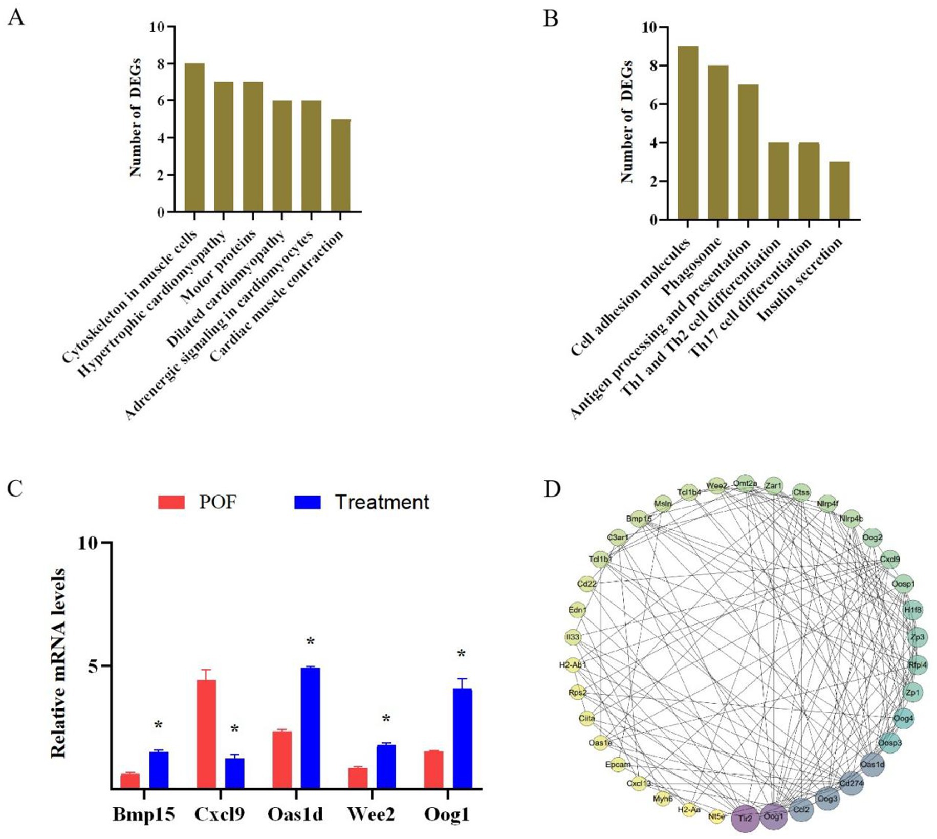 Figure 6. DEGs signaling pathway and protein interaction analysis. (A) KEGG enrichment analysis of up-regulated genes. (B) KEGG enrichment analysis of down-regulated genes. (C) RT-qPCR verified RNA sequencing. (D) Proteins-proteins interaction analysis. *p < 0.05 vs. the POF group.