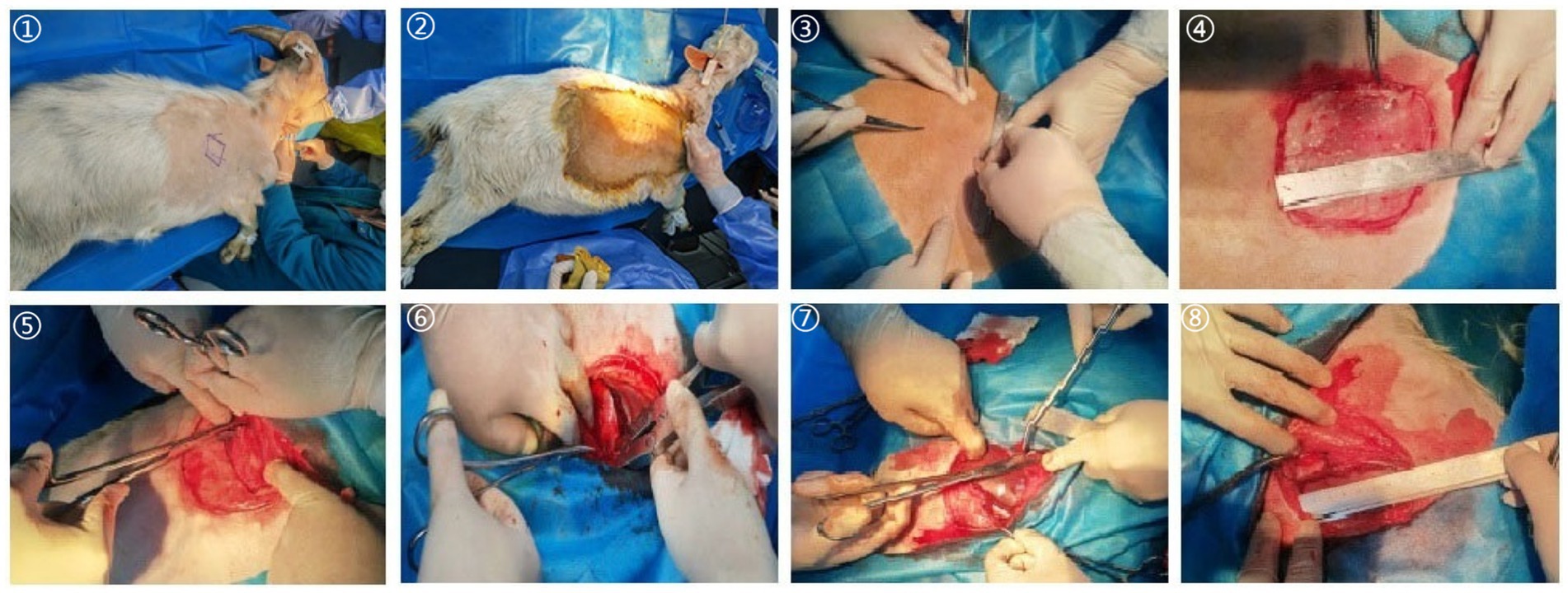Following general anesthesia, the right thoracic wall tissue of each goat was resected to prepare a thoracic defect model with a size of no less than ≥6 × 6 cm2. The specific steps are as follows (Figure 1): (1) Skin disinfection, skin cutting, separation of fat, muscle and other tissues, and exposure of the 5th to 8th ribs; (2) Measure the size of the defect with a sterile ruler; (3) Use the bone-biting forceps to bite off the 5th to 8th ribs, resect the bitten ribs and the adjacent intercostal muscles, and prepare chest wall defects no less than 6 × 6 cm2; (4) When removing the ribs, ligate the intercostal arteries and apply bone wax to the bone marrow cavity.