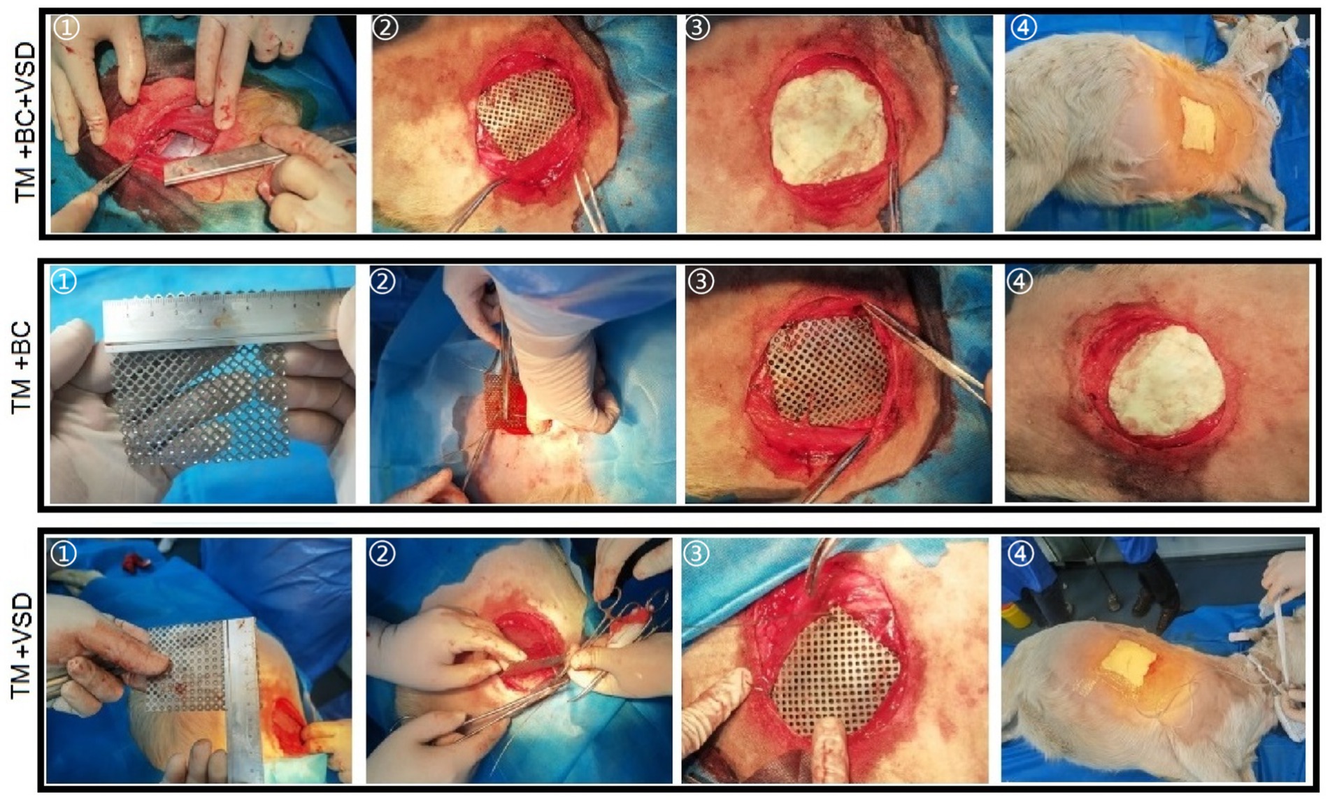 Twenty-one goat were randomly divided into the TM + BC + VSD, TM + BC and TM + VSD groups by random lottery, with 7 goat in each group. The steps for repairing chest wall defects in goat in the TM + BC + VSD group (Figure 2): (1) TM fixation: Measure the size of the chest wall defect, cut an appropriate TM for repair, and fix the TM to the ribs with steel wire. First, fix the right anterior lower rib and the TM, then the right anterior upper rib and the TM, followed by the right posterior lower rib and the TM, and finally the right posterior lower rib and the TM. Finally, use No. 7 silk thread to fix the right anterior and right posterior intercostal muscles and the TM. (2) BC sealing: Then, evenly cover the TM with the adjusted BC, with a thickness of 3 mm to 5 mm. (3) Establish VSD: Cover the surface of the BC with VSD excipients, stick and fix them with medical transparent adhesive tape excipients, connect a portable VSD negative pressure device, adjust the continuous negative pressure suction mode, and adjust the pressure to 50–100 mmHg. Fix the VSD negative pressure device to the neck of the goat with a bandage. (4) After the operation, ceftizoxime at a dose of 5 mg/kg and 20 mL of normal saline were intravenously injected. The repair of chest wall defects in goat in the TM + BC group (Figure 2) was the same as that in the TM + BC + VSD group except for not establishing VSD. The repair of chest wall defects in goat in the TM + VSD group (Figure 2) was the same as that in the TM + BC + VSD group except for not performing BC sealing. After the operation, the operation records were completed. After the goat regained consciousness from anesthesia, they were observed for 2 h to monitor vital signs such as heart rate, respiration, body temperature, and blood oxygen saturation. Once they were stable, they were sent to the breeding farm for rearing for a total of 28 days.