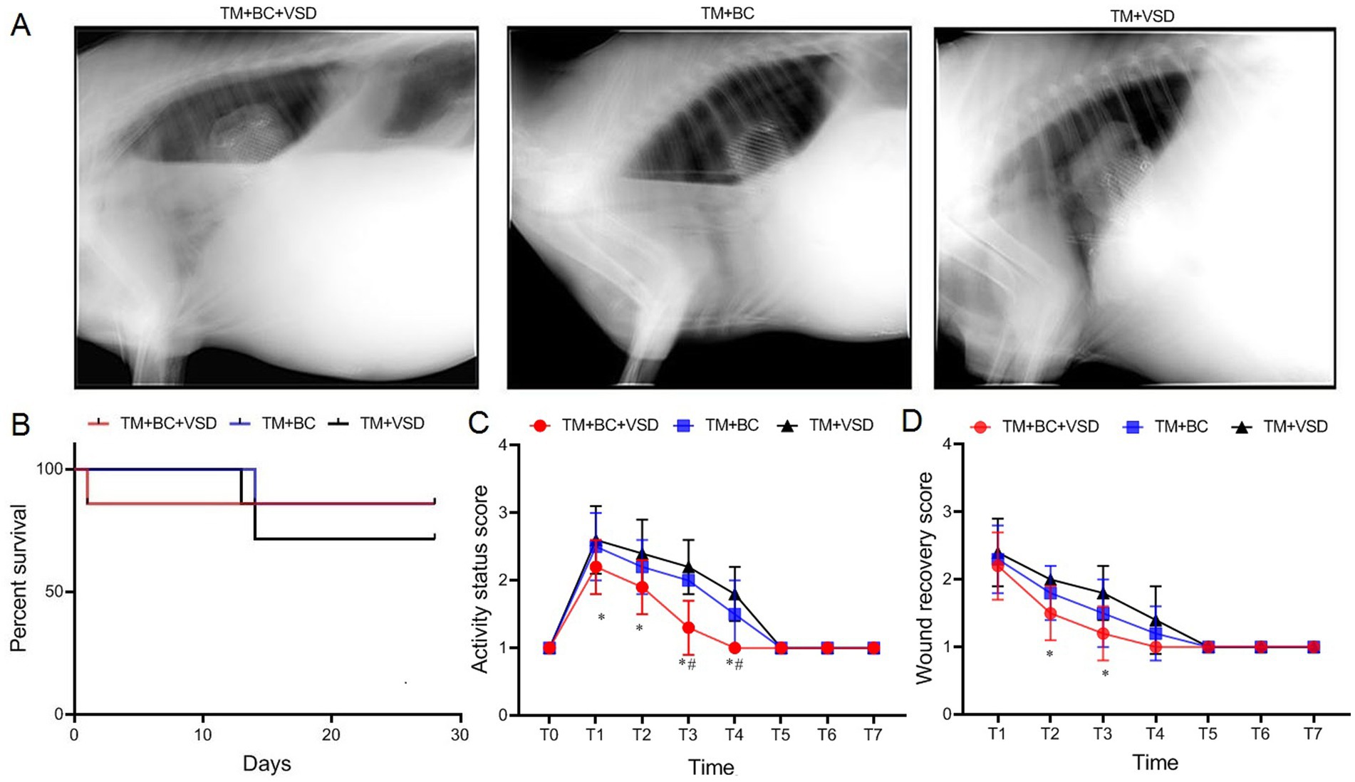 Figure 3. Postoperative recovery comparison among the three goat groups. (A) Portable DR imaging of Chest wall defect repair; (B) Postoperative survival comparison among the three groups; (C) Postoperative activity status score comparison among the three groups; (D) Postoperative wound recovery score comparison among the three groups. Compared with the TM + VSD group, *p < 0.05; Compared with the TM + BC group, #p < 0.05.