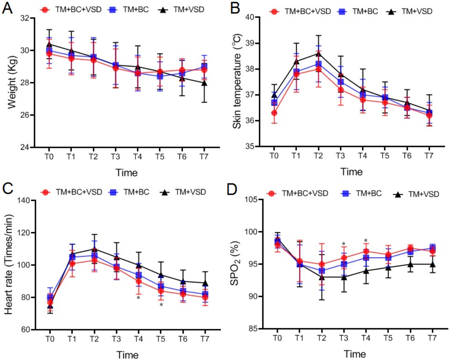 Figure 4. Vital signs comparison among the three goat groups. (A) Weight comparison among the three groups; (B) Skin temperatures comparison among the three groups; (C) Heart rates comparison among the three groups; (D) SpO2 comparison among the three groups; Compared with the TM + VSD group, *p < 0.05; Compared with the TM + BC group, #p < 0.05.