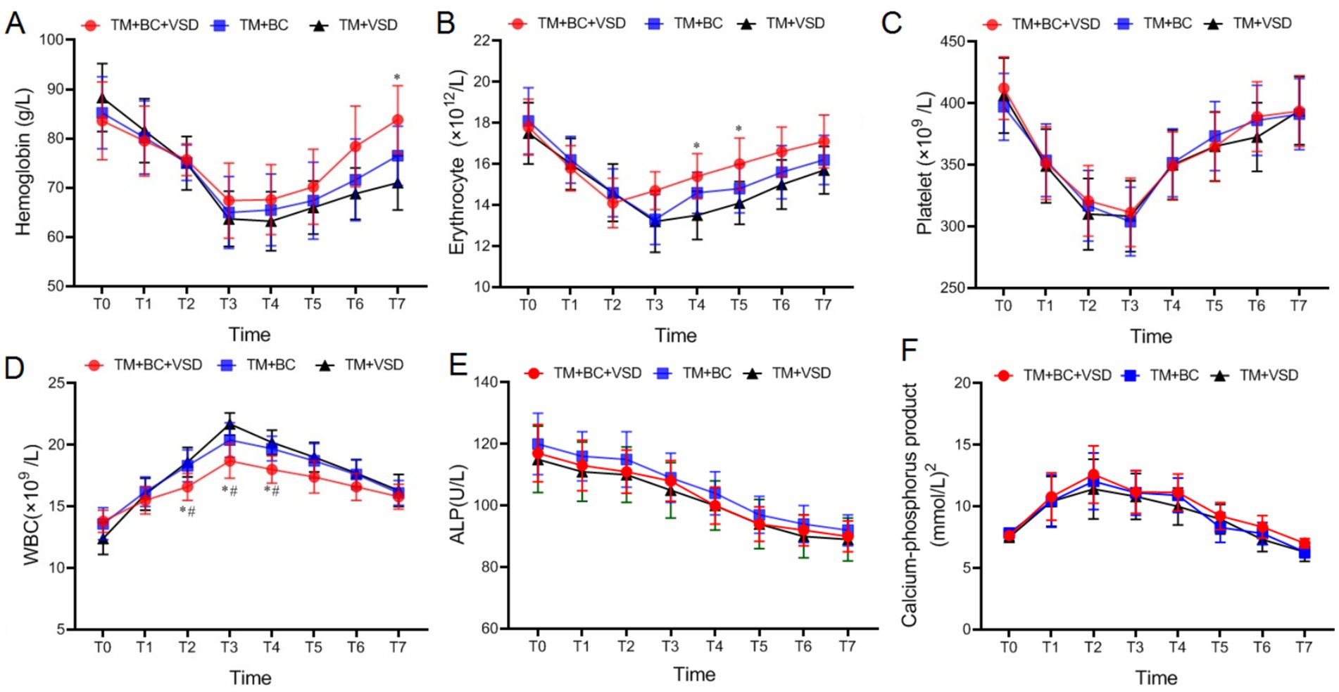 Figure 5. Routine blood and biochemical indicators comparison among the three goat groups. (A) Hemoglobin comparison among the three groups; (B) Erythrocyte comparison among the three groups; (C) Platelet comparison among the three groups; (D) WBC comparison among the three groups; (E) ALP comparison among the three groups; (F) Calcium-phosphorus product comparison among the three groups. Compared with the TM + VSD group, *p < 0.05; Compared with the TM + BC group, #p < 0.05.