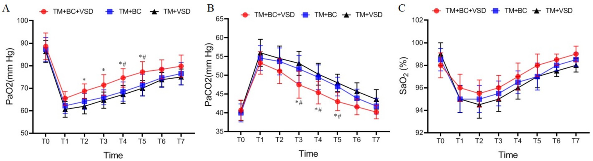 There were no statistically significant differences in the levels of PaO2, PaCO2 and SaO2 among the three goat groups before the operation (p > 0.05, Figure 6). After the operation, the levels of PaO2 and SaO2 initially decreased and then increased, while PaCO2 initially increased and then decreased (p < 0.05, Figure 6). The PaO2 in the TM + BC + VSD group at T2–T5 was significantly higher than that in the TM + VSD group, the PaO2 at T3–T4 was significantly higher than that in the TM + BC group (p < 0.05, Figure 6). The PaCO2 at T3–T5 was significantly lower than that in both the TM + VSD and TM + BC groups (p < 0.05, Figure 6). No statistically significant differences were observed in SaO2 among the three groups (p > 0.05, Figure 6).