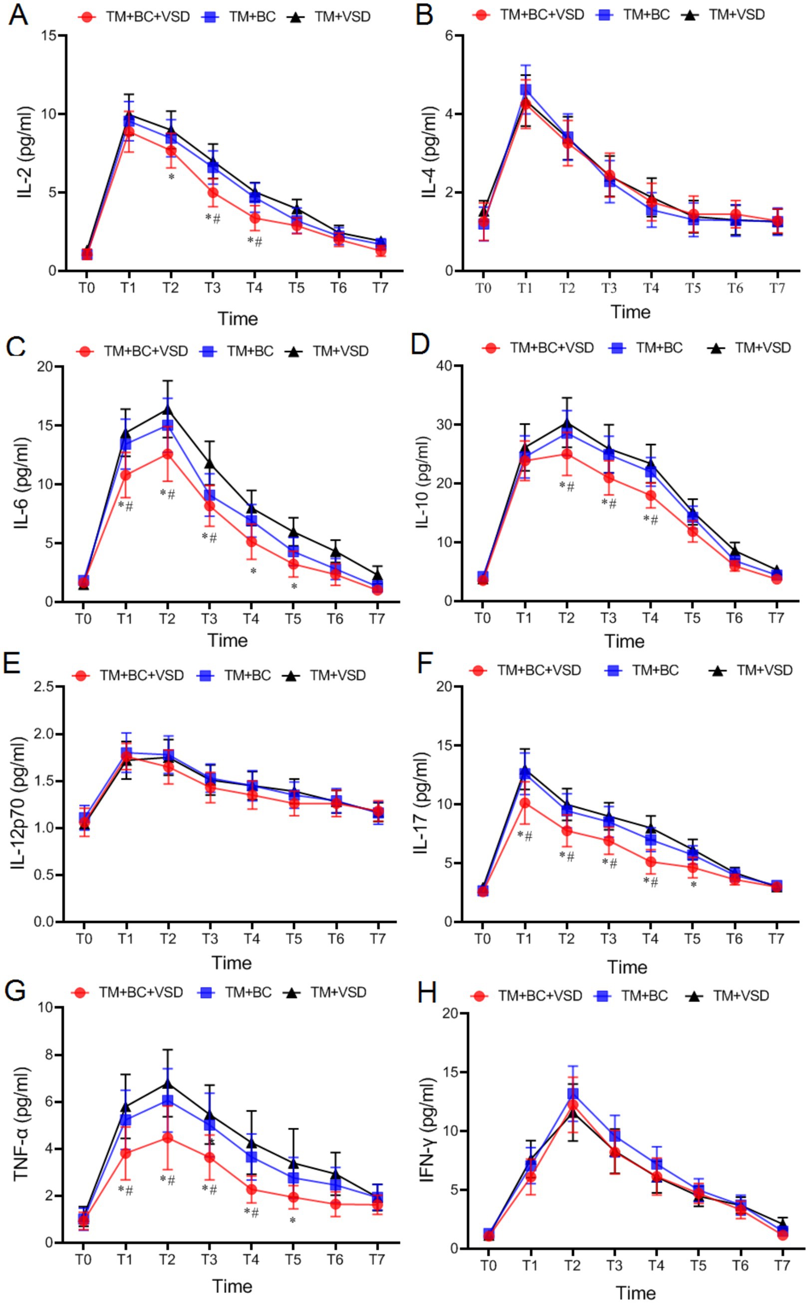 Figure 7. Serum inflammatory factor levels comparison among three goat groups. (A) IL-2 comparison among the three groups; (B) IL-4 comparison among the three groups; (C) IL-6 comparison among the three groups; (D) IL-10 comparison among the three groups; (E) IL-12p70 comparison among the three groups; (F) IL-17 comparison among the three groups; (G) TNF-α comparison in three groups; (H) IFN-γ comparison among the three groups of goat. Compared with the TM + VSD group, *p < 0.05; Compared with the TM + BC group, #p < 0.05.