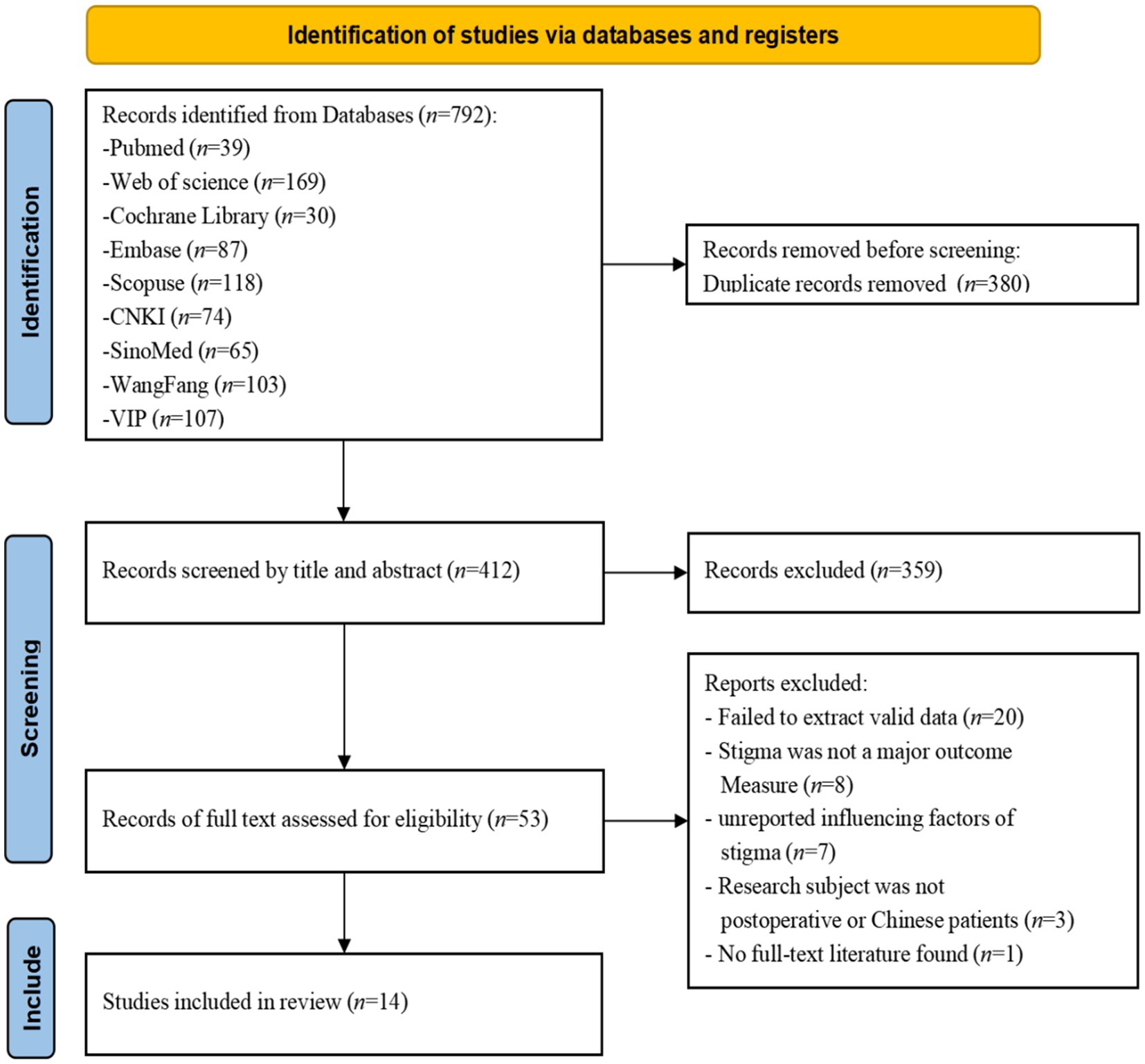 A total of 792 potentially eligible literature articles were extracted from various databases, of which 380 were removed based on duplicated records. The remaining 412 articles were checked manually by Covidence and EndNote software; 359 articles were eliminated after reading the titles and abstracts, and 39 articles were eliminated after reading the entire texts. Ultimately, 14 studies with a total of 2,873 patients satisfied the inclusion requirements (see Figure 1). The excluded studies and reasons are detailed in Supplementary material 2.