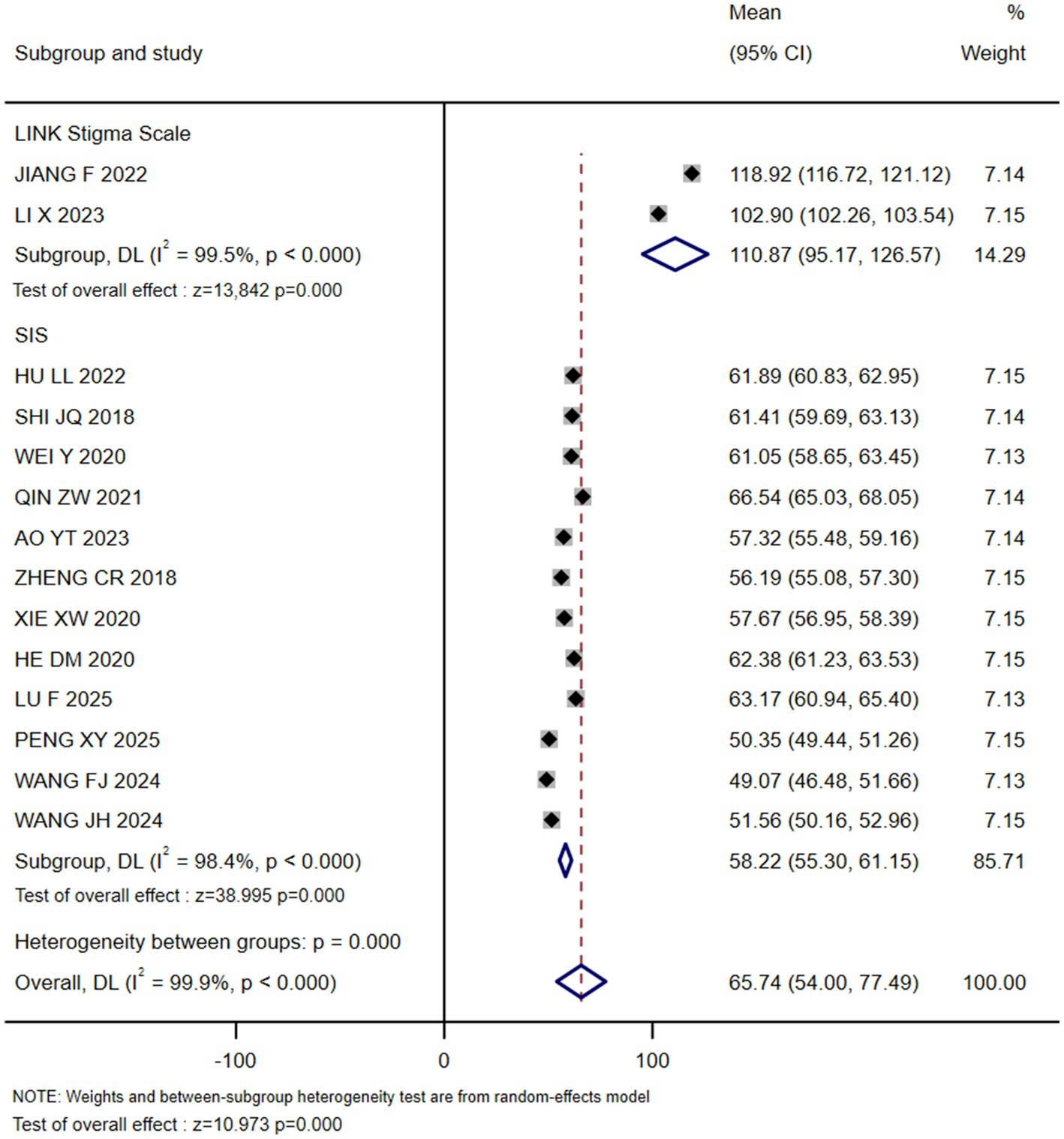 A single-arm synthesis was conducted to estimate pooled mean stigma scores. Raw mean values with corresponding standard deviations (or standard errors) served as the primary data for synthesis. The DerSimonian-Laird random-effects model was applied to account for anticipated heterogeneity across studies. The use of means and standard deviations for meta-analysis is conventional for continuous outcome data and assumes that the stigma scores from the included studies approximate a normal distribution and can be treated as parametric data. Subgroup analyses were stratified by measurement scale type to examine instrument-specific effects. Results were expressed as weighted mean values with 95% confidence intervals.