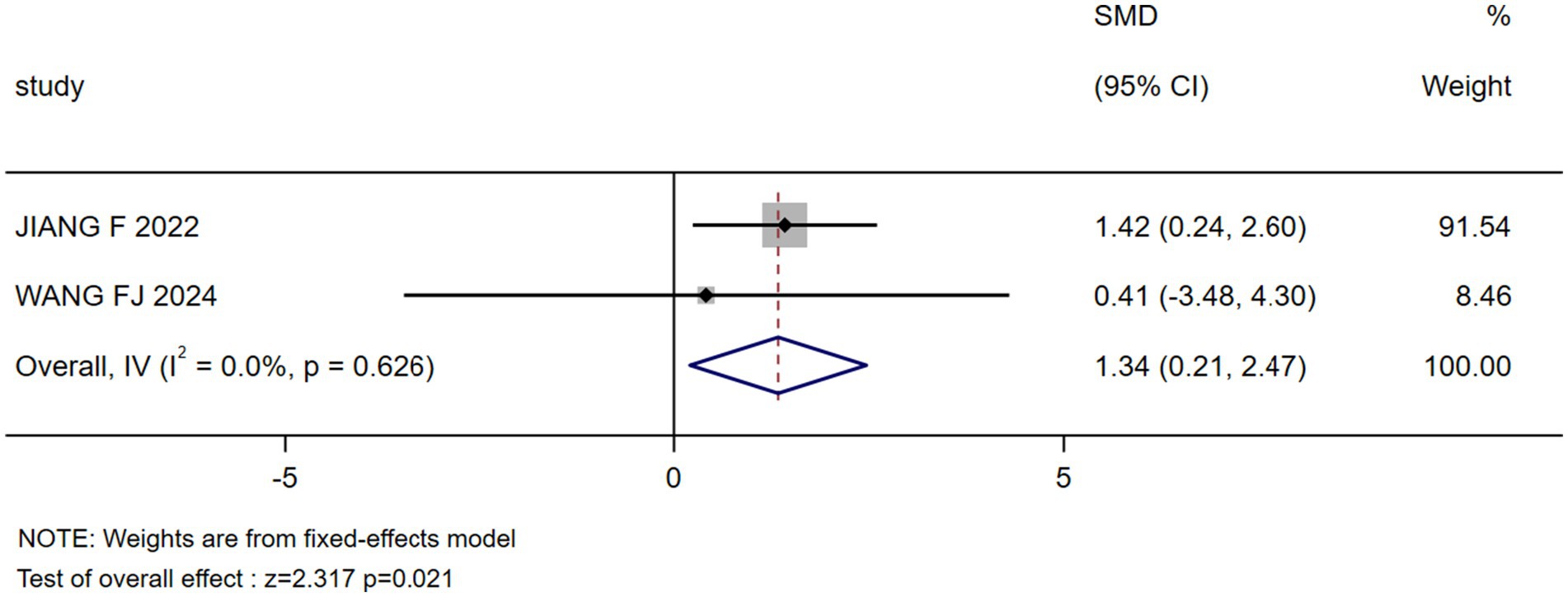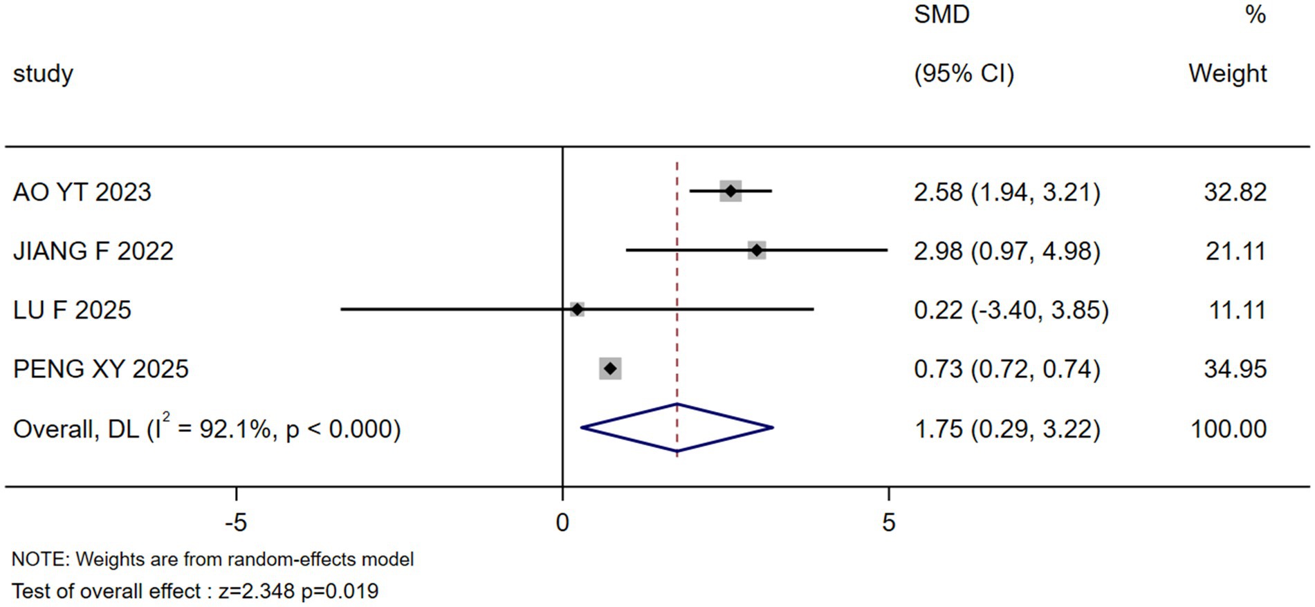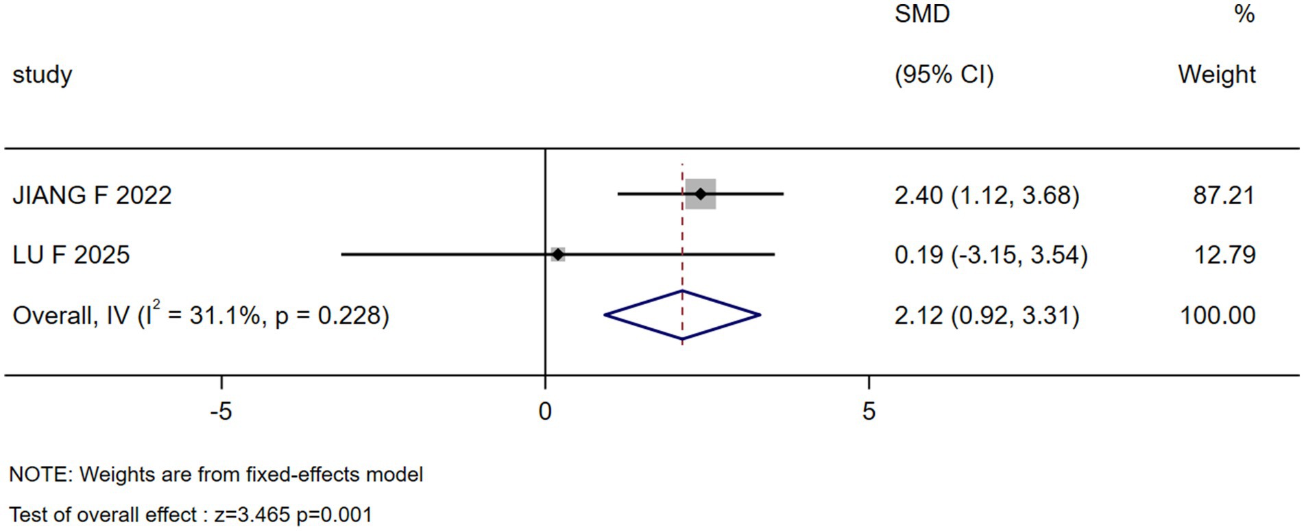 For factors reported in <2 studies, descriptive synthesis was performed by reporting individual study effect sizes without quantitative pooling. For factors reported in ≥2 studies, standardized mean differences (SMD) were computed as the comparative effect measure. All factors were analyzed using inverse-variance weighted fixed-effects or random-effects models, selected based on the results of heterogeneity tests.