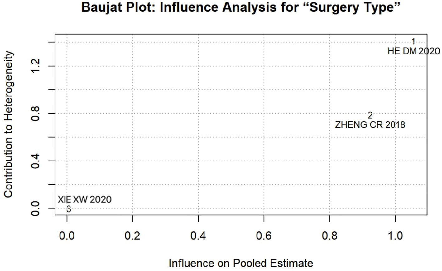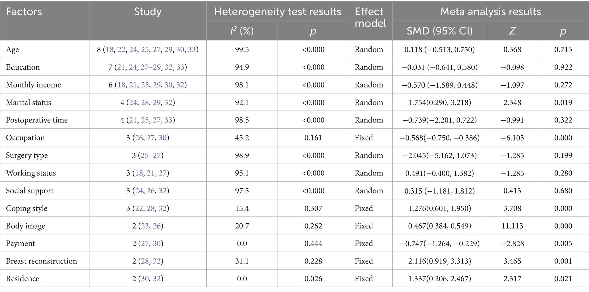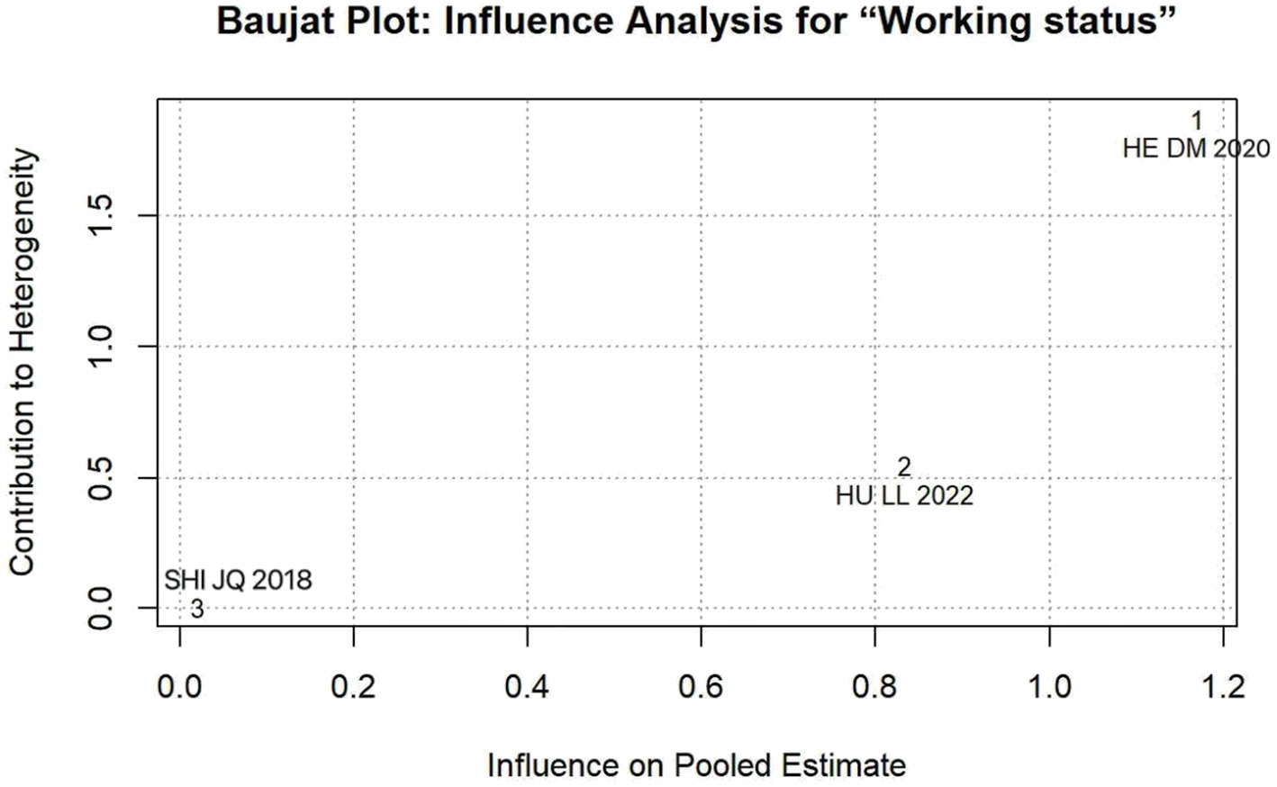 The results of the sensitivity analysis indicated that the effect (95% CI) and p value of six influencing factors, namely age, education, monthly income, surgery type, working status, and social support, underwent significant changes between fixed- and random-effects models, indicating instability (see Table 4). To pinpoint the source of this instability, we performed leave-one-out analyses (see Table 5). This procedure revealed that the study by He et al. (27) was solely responsible for the instability in the factors “surgery type” and “working status.” Specifically, the exclusion of He et al. (27) transformed the pooled effect for both factors from non-significant to statistically significant (p < 0.05), while simultaneously reducing heterogeneity substantially. This finding was objectively confirmed using Baujat plots for influence diagnostics (Figures 10, 11). The plots visually identified He et al. (27) as a clear outlier, located in the upper-right quadrant, indicating its strong and disproportionate influence on both the overall result and heterogeneity for these two factors. Therefore, the results for “surgery type” and “working status” should be interpreted with caution due to their dependence on a single, influential study, highlighting the need for future research to verify these associations.