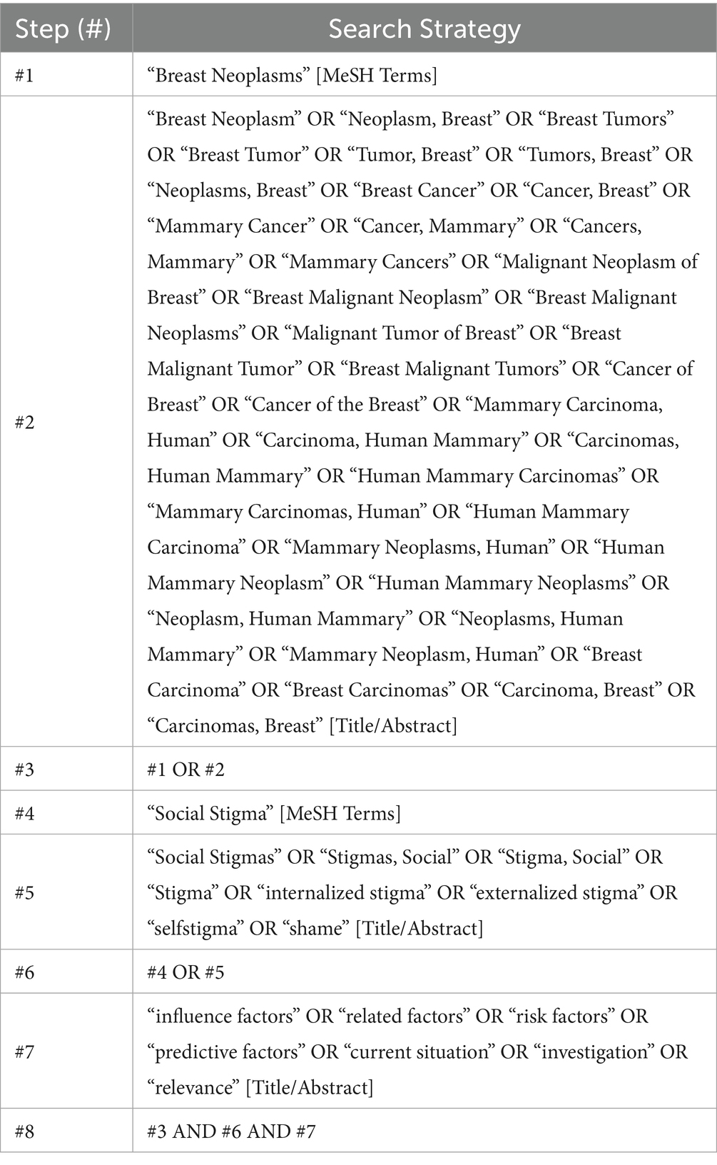The Chinese and English databases searched were as follows: (a) the Chinese databases included China Biology Medicine Disc (CBM), China National Knowledge Infrastructure (CNKI), Wanfang Data Knowledge Service Platform (WangFang), and China Science and Technology Journal Database (The VIP); (b) the English databases included Cochrane Library, PubMed, Embase, Scopus, Medline, and Web of Science; and (c) grey databases were also searched, including the National Institute for Health Research (NIHR). The search included all observational studies that described the level of stigma and factors influencing it in postoperative breast cancer patients. The search period was from the establishment of each database to 14 July 2025. Table 1 shows an example of one of the databases searched, namely, PubMed. The search formula and related information are detailed in Supplementary material 1.