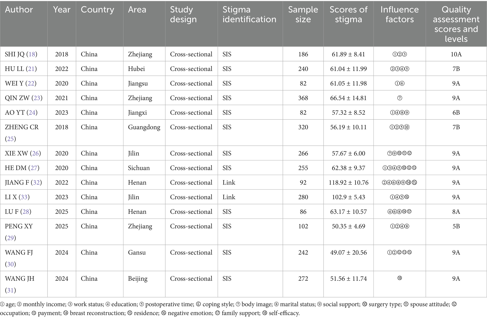 Eighteen potential influencing factors were identified across the 14 included studies. The following influencing factors were each reported by a single study: XIE XW et al. (26) found that spouse attitude was an independent predictor of stigma (β = 1.336, p < 0.01). Notably, when the spouse attitude was “caring,” the level of stigma significantly increased. Concurrently, the study by LI X et al. (33) reported a strong positive correlation between the total score of negative emotions and the sense of stigma (r = 0.530, p < 0.01). On the other hand, protective factors were also shown to effectively reduce these feelings. LU F et al. (28) found that good family support could enhance patients’ courage and confidence in facing external pressure, thereby reducing postoperative stigma (β = 0.277, p < 0.001). Similarly, WANG JH et al. (30) confirmed that the total score of self-compassion was significantly negatively correlated with stigma (r = −0.349, p < 0.01), which can independently explain 12.2% of the variation in stigma (R2 = 0.122, p < 0.001).