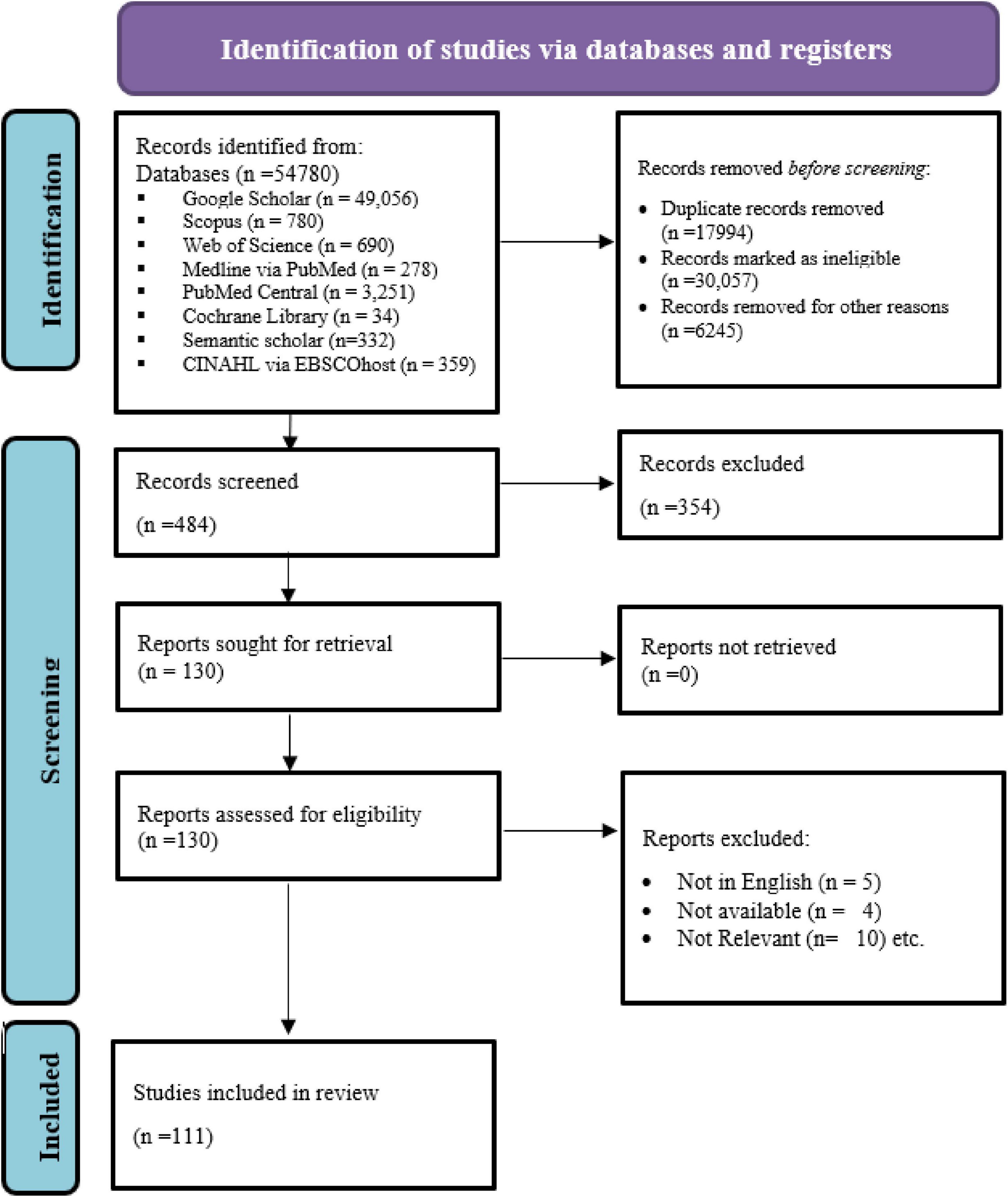 To retrieve relevant research articles, a comprehensive search was conducted across several well-established databases, including Medline via PubMed, Web of Science, Pub-Med Central, Cochrane, Scopus, Google Scholar, Semantic Scholar, and CINAHL (via EBSCOhost). A four-level search strategy was employed, with each level progressively expanding the breadth of the search. These strategies were informed by keywords and terms identified through an extensive preliminary literature review. Level four represented the most exhaustive phase of the search process, ensuring maximum coverage of eligible studies.