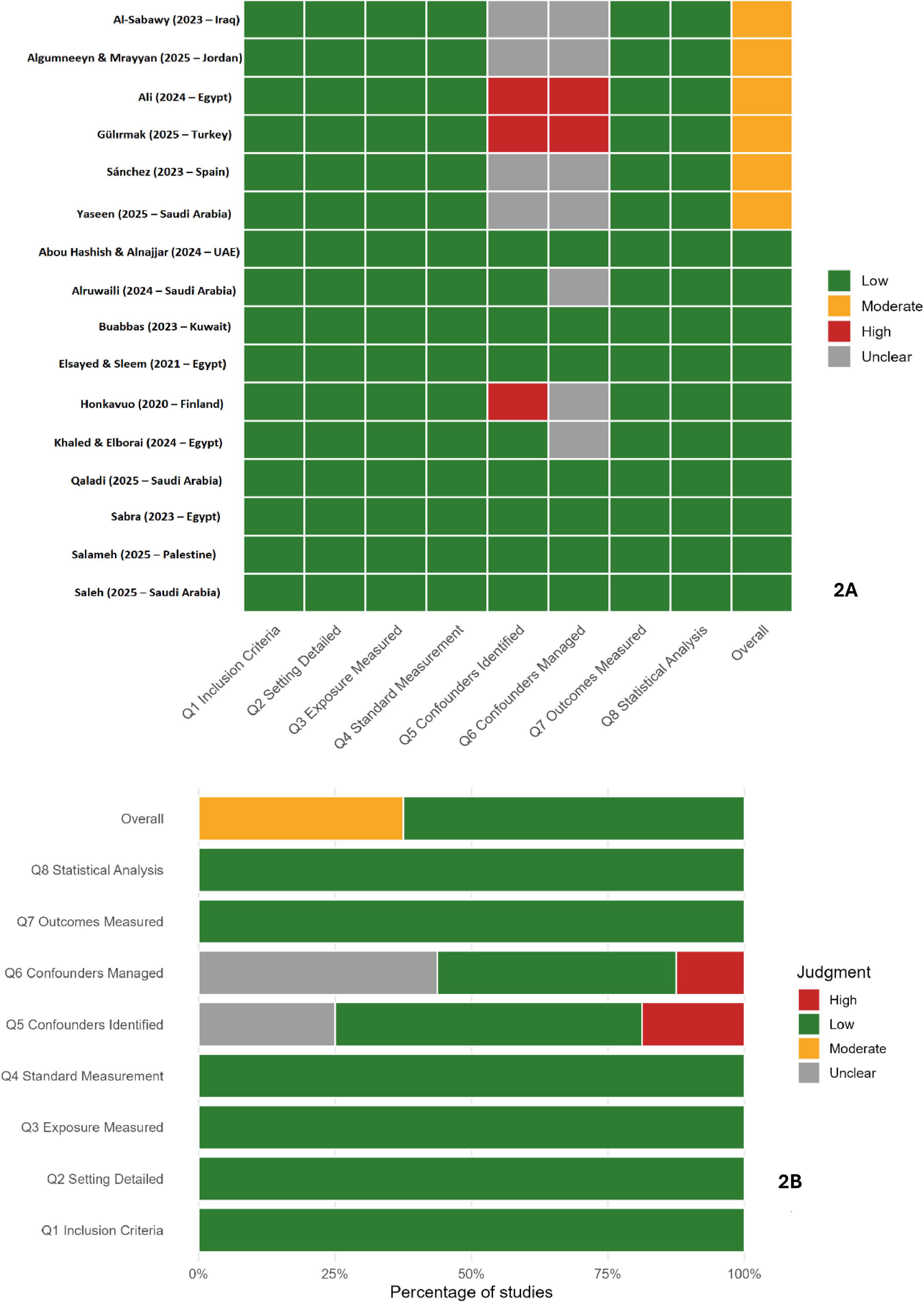 Figure 2. Risk-of-bias assessment for cross-sectional studies. (A) Traffic-light plot showing domain-wise risk-of-bias judgments for the 16 cross-sectional studies (JBI checklist). (B) Summary plot showing the proportion of studies rated Low, Moderate, High, or Unclear risk across JBI domains.
