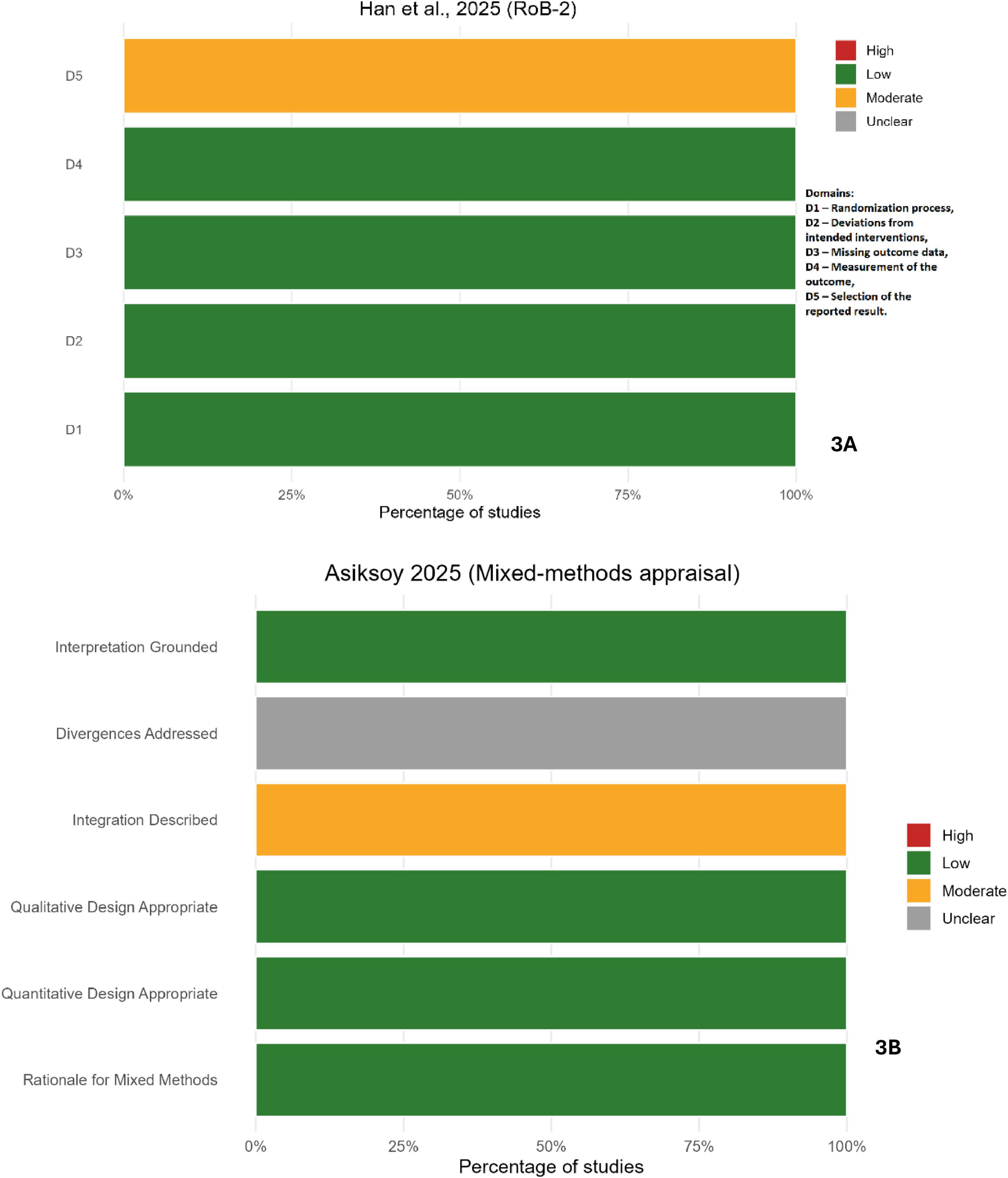 Assessment of methodological quality indicated that the sixteen cross-sectional studies predominantly exhibited low to moderate risk of bias (Figures 2A, B). Most met key appraisal criteria, including clearly defined inclusion parameters, valid outcome measurements, and appropriate analytical procedures. Residual methodological limitations were primarily related to the incomplete adjustment for confounding variables and the limited representativeness of the participant samples. The randomized controlled trial demonstrated an overall low risk of bias, with minor concerns regarding allocation concealment (Figure 3A). The mixed-methods studies were both judged to be of acceptable methodological quality, showing limited integration between quantitative and qualitative components (Figure 3B). The collective appraisal suggests that the included evidence was of sound quality, lending confidence to the synthesized estimates.